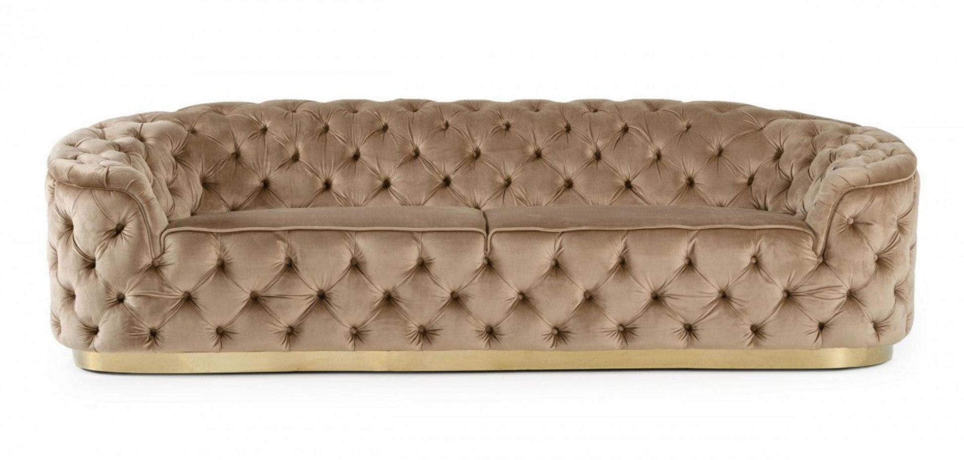 Add an air of fashion to your space with this fabulous 102-inch beige velvet sofa with gold legs. This solid color standard is made from sturdy and resilient velvet that has a warm and rich look and is a super soft and comfortable to the touch. Solid colors give you lots of decorative options and are easy to work into your decor scheme. Sinuous springs construction gives this piece strong support and makes it comfortable to sit even for long periods of time. Flared arm offer a comfy place to rest. The tufted stitching pattern adds visual interest and fine designer detailing. Gold metal legs effortlessly elevate the room and add a touch of contemporary design. Built to last, this sofa will be a great centerpiece for your room. 29.5-inch H x 102.4-inch W x 40.6-inch D
