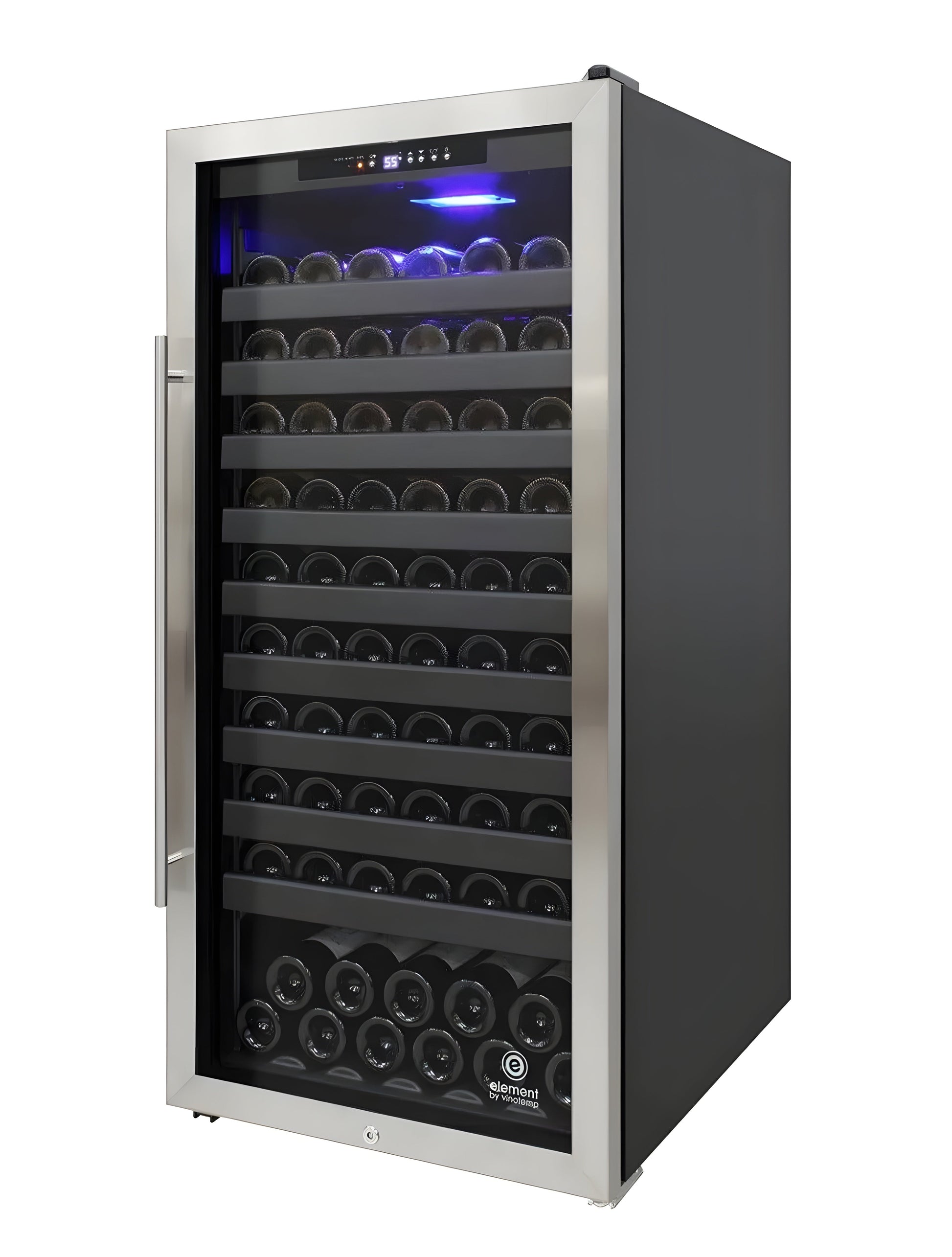 A: The Vinotemp EL-100SBB is a freestanding wine cooler with a 114-bottle capacity, designed for optimal long-term wine storage with a single-zone cooling system.