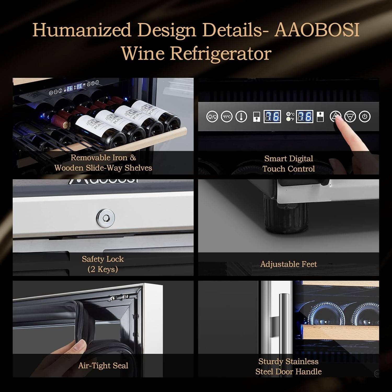 154 BOTTLES CAPACITY The AOBOSI 24'' wine fridge features 14 beech wooden shelves that can store up to 154 bottles of standard Bordeaux (750 ml) wine, the bottom shelf has large capacity that you can load large bottles. Removable wooden shelf with rails for easy sliding in or out without damaging bottles.