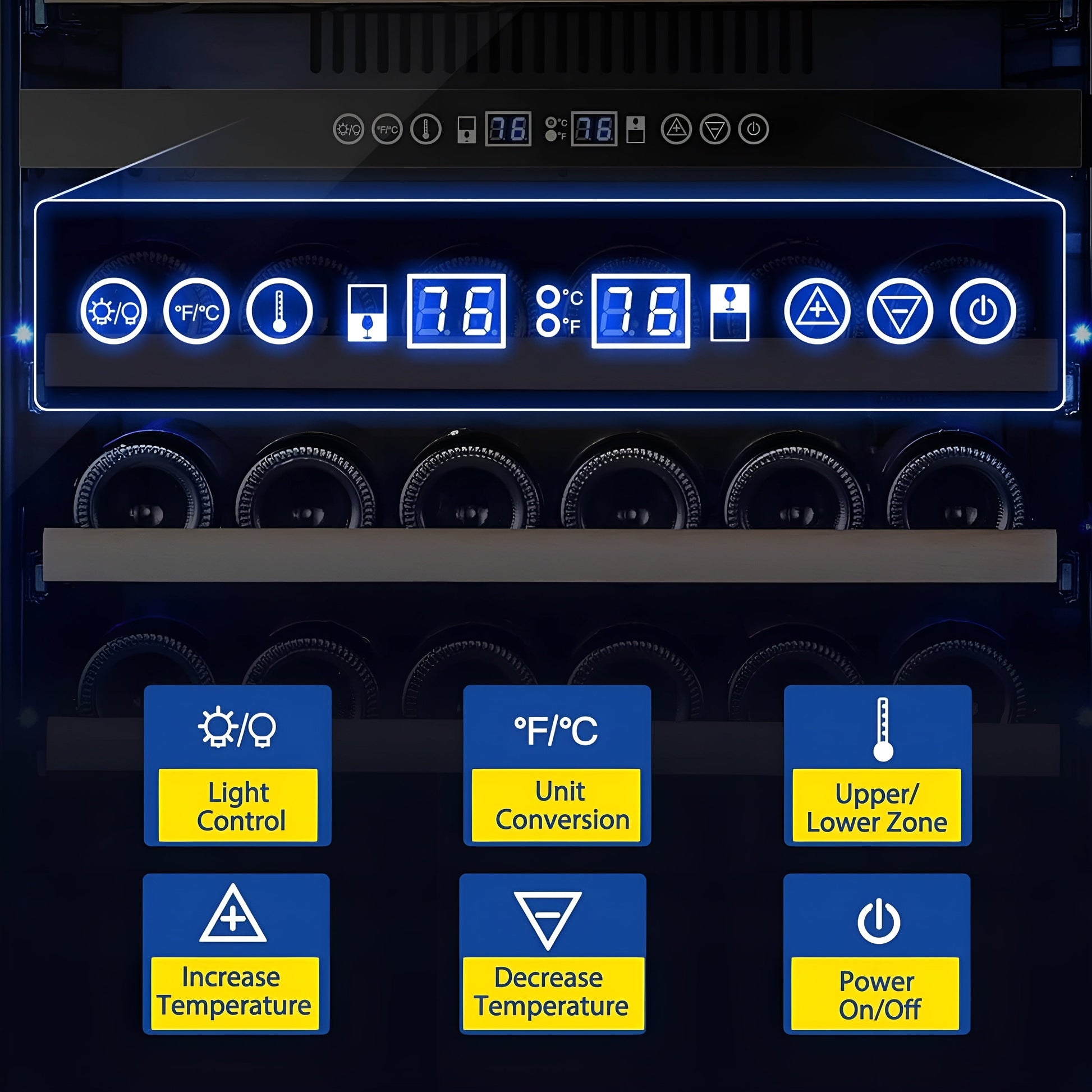 The cooler features an easy-to-use digital touchscreen control panel with a clear LED display to set and adjust the temperature for each zone individually.