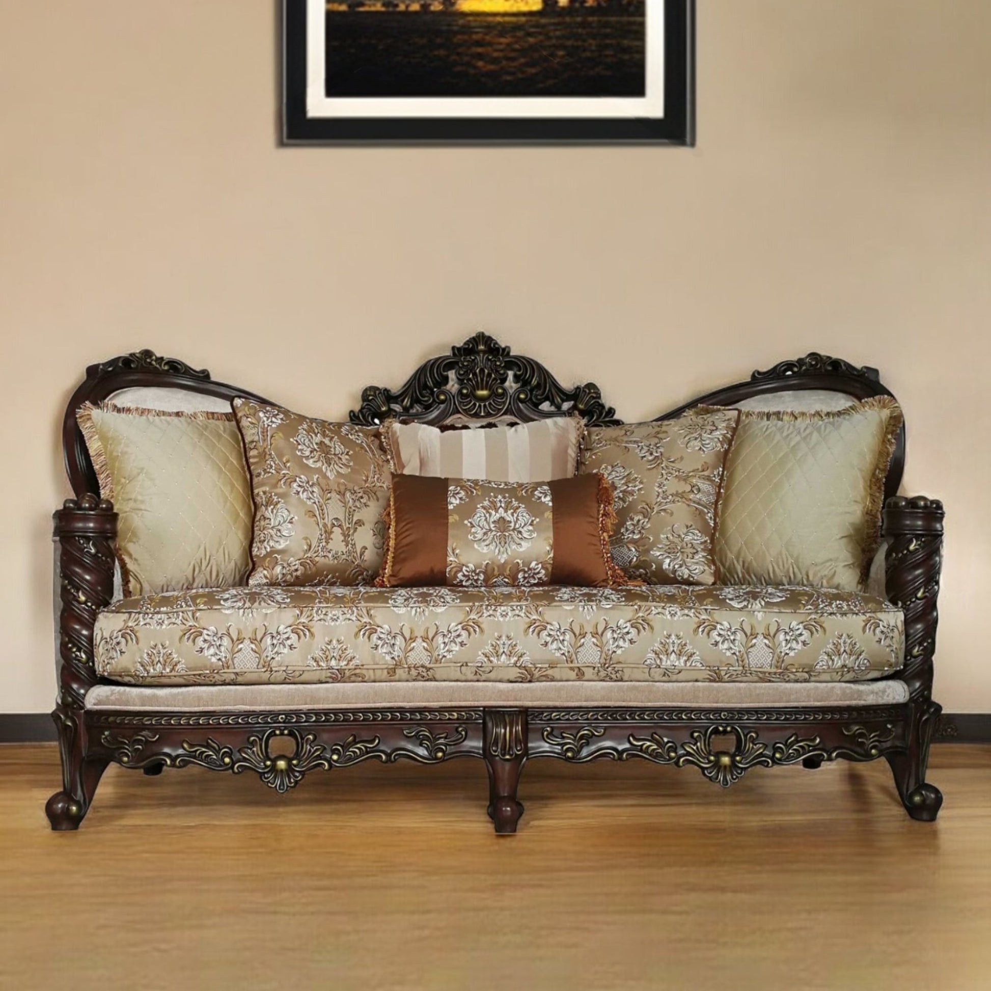 A: This compact yet elegant sofa features beige floral upholstery, matching toss pillows, and sturdy dark legs—offering a blend of luxurious comfort and timeless style.