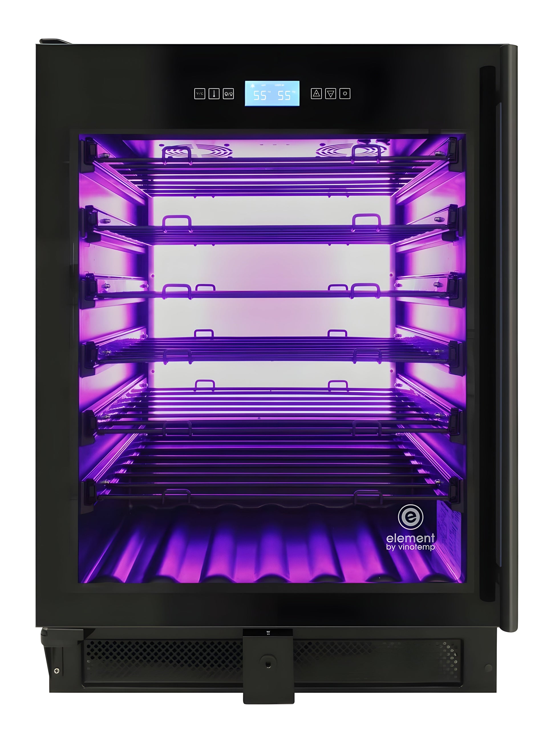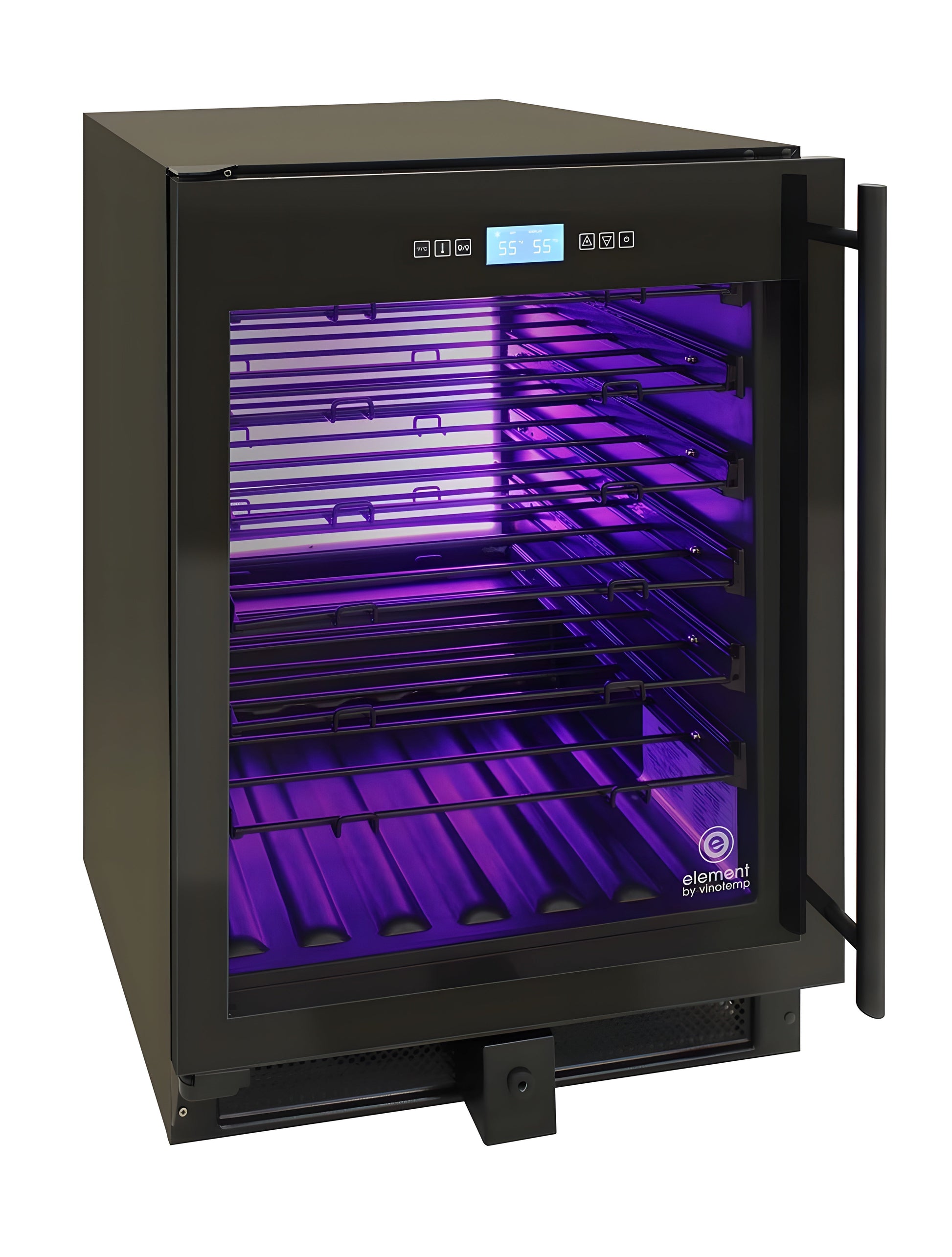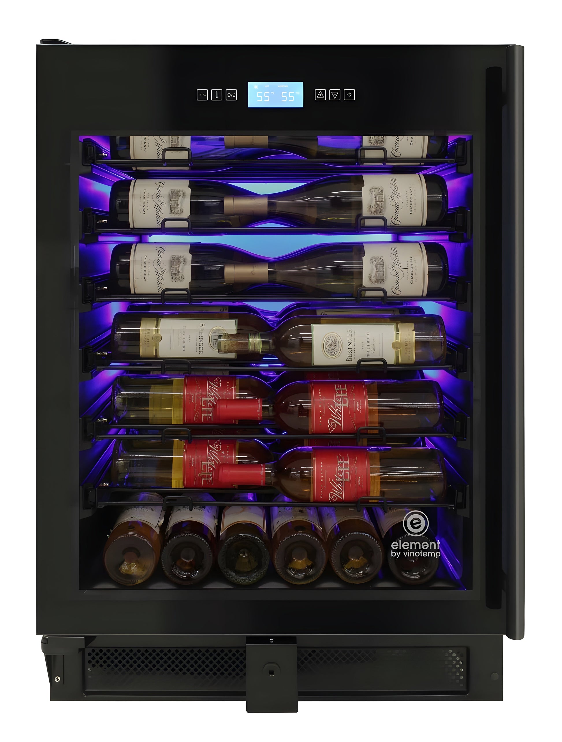 Store your wine collection in this elegant Vinotemp 41-Bottle Single-Zone Wine Cooler. Featuring seamless, all-glass technology, this all-black wine refrigerator has room to store up to 41 bottles on six telescopic shelves and 1 bulk storage section. A digital temperature touchscreen controller located at the top of the cooler allows you to see and set the temperature without having to open the cooler door. Its patented interior Backlit panel lighting has three different color options - Heliotrope, Amber, and Vinotemp BioBlu (which helps reduce the growth of bacteria and mold) - and can be selected at any give time. This wine refrigerator is front venting with easy installation to build in and fit perfectly in any kitchen or bar area. Sturdy, stylish patented label forward VinBo Racks in black cradle bottles so the labels of wine stored are front facing while the racks glide and extend forward, adding to the cooler's visual appeal and ease of use. A full glass door with black edge and door lock add to the style and functionality of this cooler. This wine cooler will make your small to medium sized wine collection stand out.