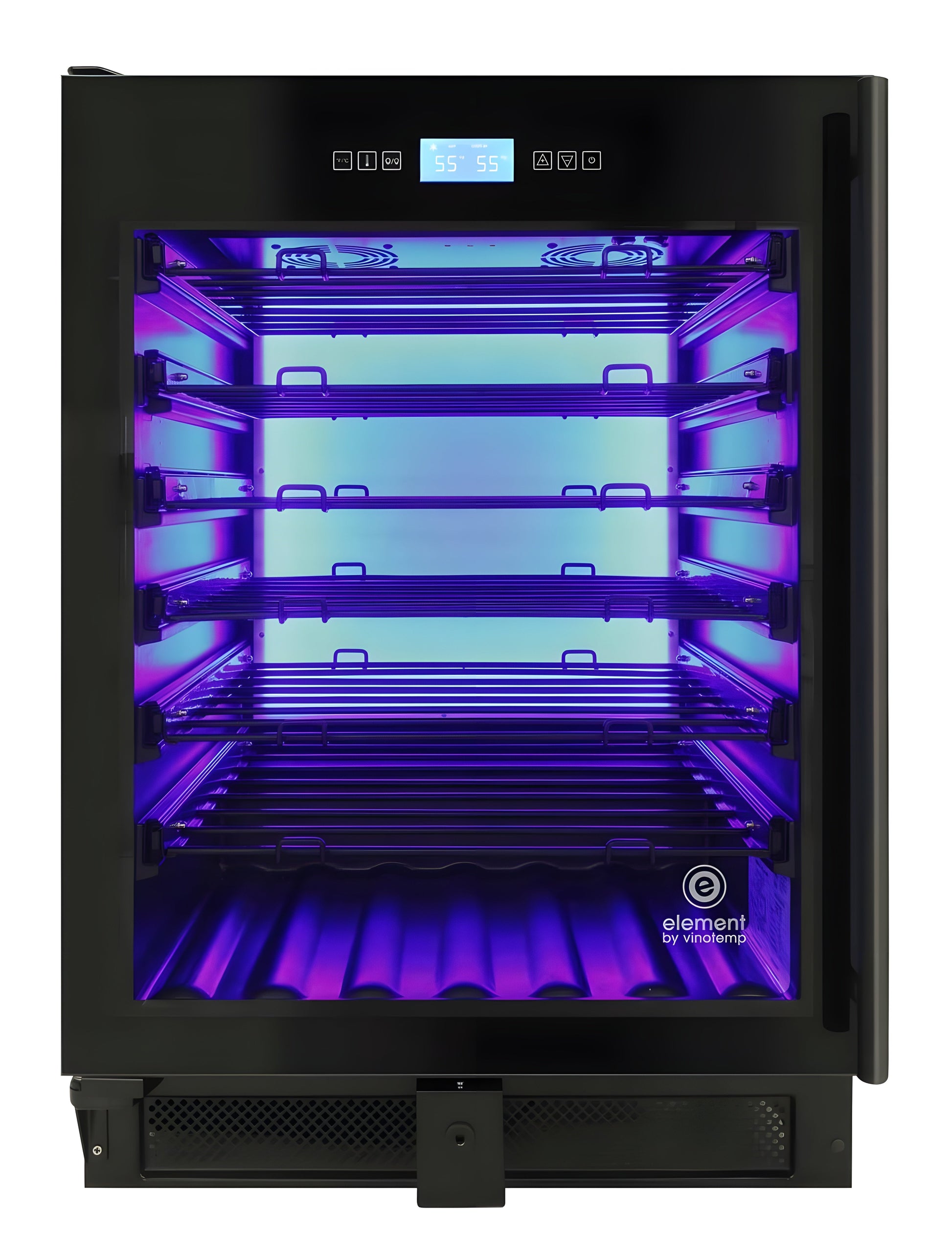 Store your wine collection in this elegant Vinotemp 41-Bottle Single-Zone Wine Cooler. Featuring seamless, all-glass technology, this all-black wine refrigerator has room to store up to 41 bottles on six telescopic shelves and 1 bulk storage section. A digital temperature touchscreen controller located at the top of the cooler allows you to see and set the temperature without having to open the cooler door. Its patented interior Backlit panel lighting has three different color options - Heliotrope, Amber, and Vinotemp BioBlu (which helps reduce the growth of bacteria and mold) - and can be selected at any give time. This wine refrigerator is front venting with easy installation to build in and fit perfectly in any kitchen or bar area. Sturdy, stylish patented label forward VinBo Racks in black cradle bottles so the labels of wine stored are front facing while the racks glide and extend forward, adding to the cooler's visual appeal and ease of use. A full glass door with black edge and door lock add to the style and functionality of this cooler. This wine cooler will make your small to medium sized wine collection stand out.
