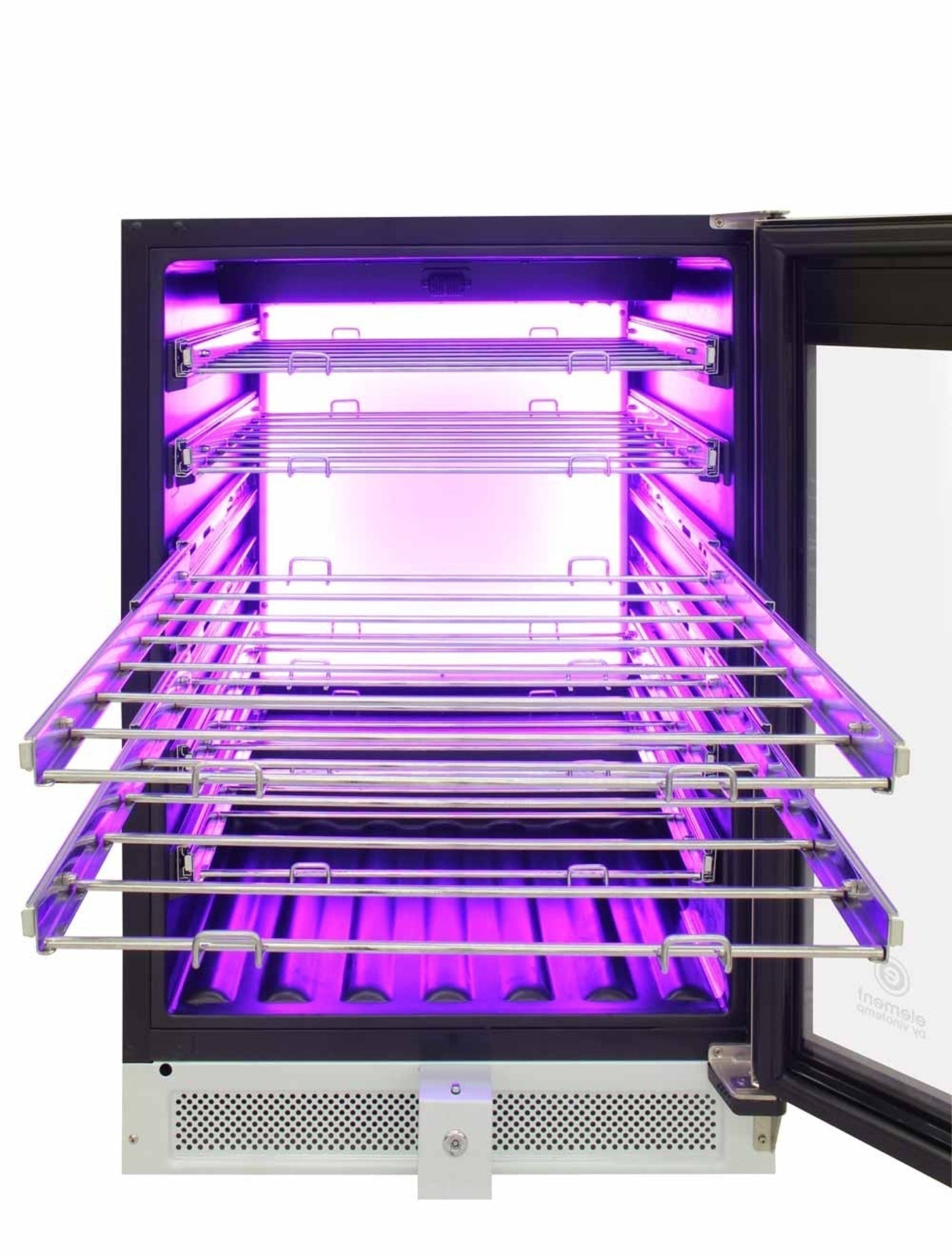 Store your wine collection in this elegant Vinotemp 41-Bottle Single-Zone Wine Cooler. Featuring seamless, all-glass technology, this wine refrigerator has room to store up to 41 bottles on six telescopic shelves and 1 bulk storage section. A digital temperature touchscreen controller located at the top of the cooler allows you to see and set the temperature without having to open the cooler door. Its patented interior Backlit panel lighting has three different color options - Heliotrope, Amber, and Vinotemp BioBlu (which helps reduce the growth of bacteria and mold) - and can be selected at any give time. This wine refrigerator is front venting with easy installation to build in and fit perfectly in any kitchen or bar area. Sturdy, stylish patented label forward VinBo Racks cradle bottles so the labels of wine stored are front facing while the racks glide and extend forward, adding to the cooler's visual appeal and ease of use. A full glass door with white edge and door lock add to the style and functionality of this cooler. This wine cooler will make your small to medium sized wine collection stand out.