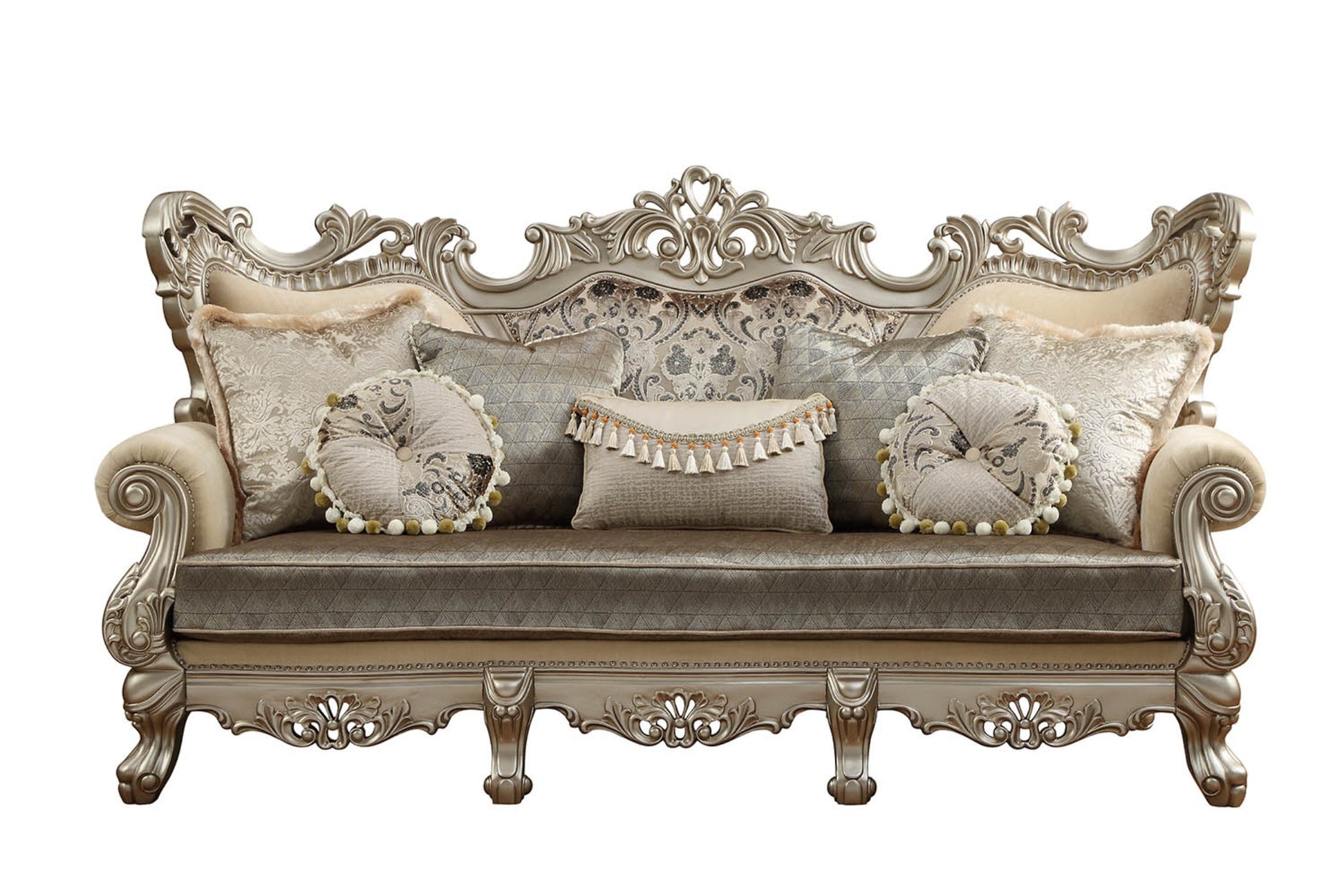 A: This luxurious sofa features a soft champagne cotton blend upholstery with a curved floral design, complemented by elegant toss pillows, adding a refined touch to your home décor.
