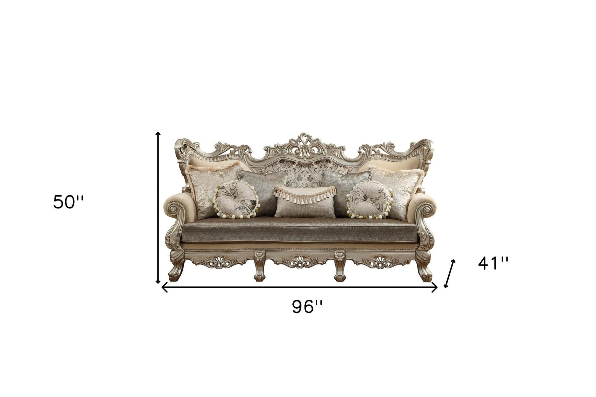 Transform your home's interior with this luxurious 41-inch champagne cotton blend curved floral sofa and toss pillows. With a warm and rich look to it, this floral curved is upholstered in cotton blend that is designed to be super soft to the touch, sturdy and resilient. Rolled arms offer a comfy place to rest. Champagne solid wood legs effortlessly elevate the room and add a touch of contemporary design. Built to last, this sofa will be a great centerpiece for your room. 50-inch H x 41-inch W x 96-inch D