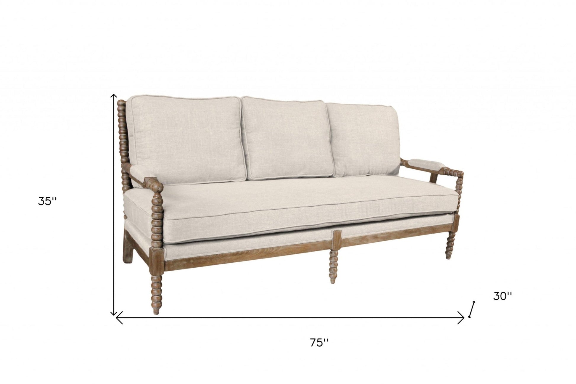 Sophisticated Style: The 75" Ivory Linen Blend Sofa brings refined elegance to any space with its soft ivory upholstery and contrasting brown legs.