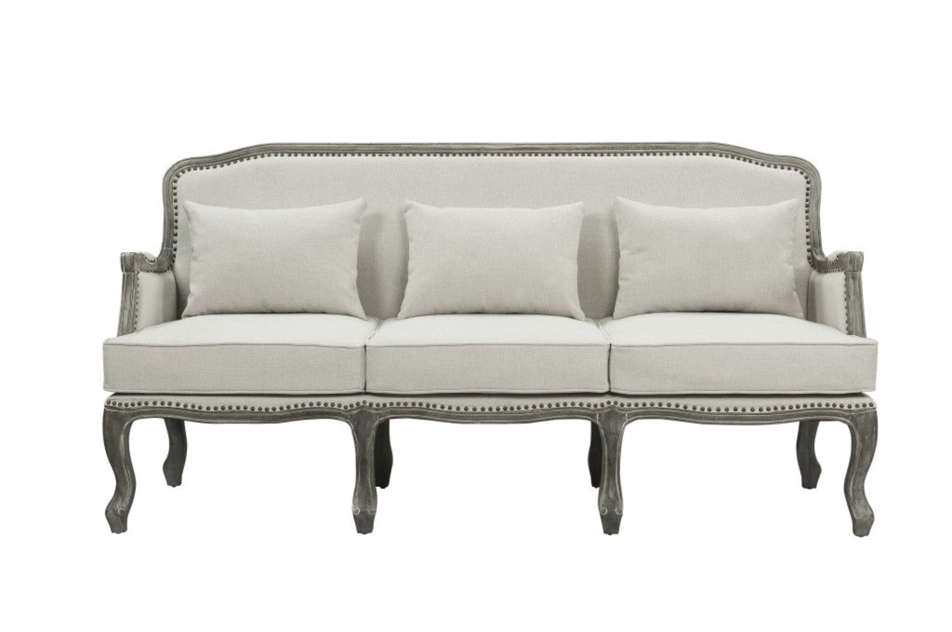 A: This elegant sofa showcases soft cream linen upholstery, rich brown legs, classic nailhead trim, and supportive cushions—blending timeless style with everyday comfort.