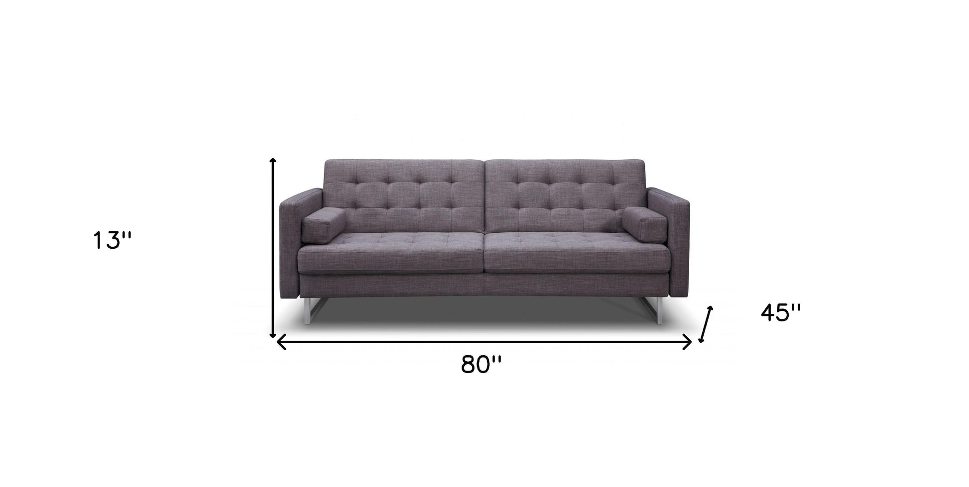 Designed for comfort and good looks, this 80-inch gray fabric sofa with silver legs is a great option to anchor your space. A great showpiece for your room, this sofa is a must-have. Upholstered in elegant gray fabric, this sofa brings a touch of sophistication to any living area. The silver legs add a modern flair to the piece, elevating its style effortlessly. With a solid gray color that exudes chic simplicity, this sofa effortlessly complements various decor styles. Ideal for relaxation and entertaining, this sofa is both stylish and practical for everyday use. 13-inch H x 80-inch W x 45-inch D