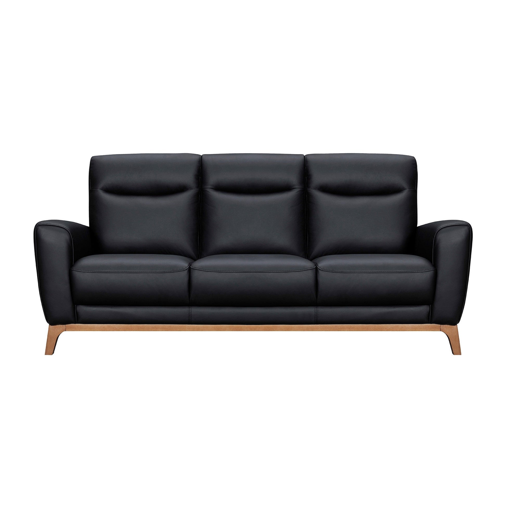 Superior construction from fabulously soft and high grade leather gives this 83-inch black leather sofa with brown legs a leg up on the competition. The premium leather used makes your lounging luxuriously comfortable and adds an elegant appeal to your space. Solid colors give you lots of decorative options and are easy to work into your decor scheme. Web suspension construction gives this piece strong support and makes it comfortable to sit even for long periods of time. Square arms offer a comfy place to rest. A great showpiece for your room, this sofa is a must have. 39-inch H x 83-inch W x 38-inch D