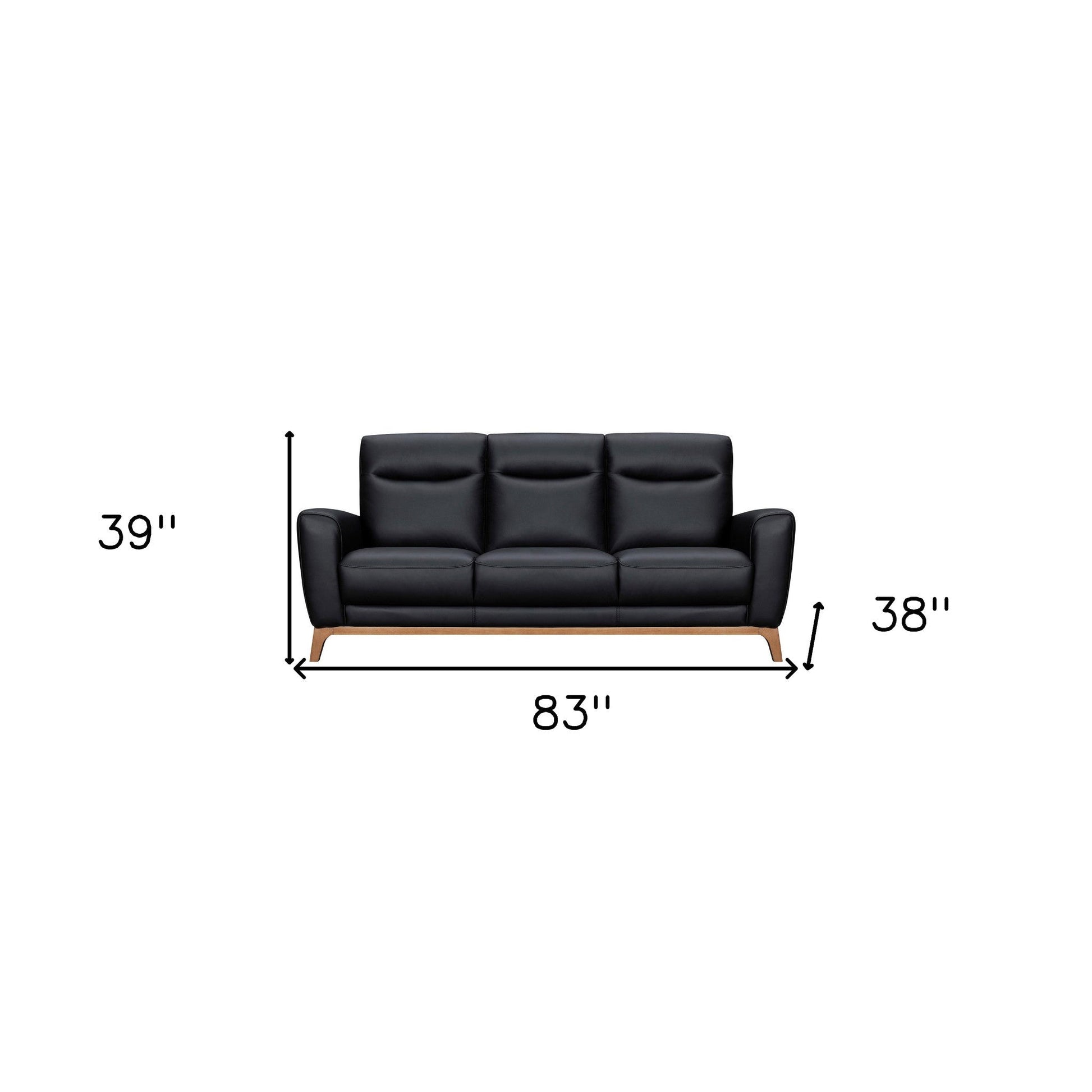 Bold Sophistication: The 83" Black Leather Sofa makes a strong style statement with its sleek black leather upholstery and elegant brown legs, ideal for upscale modern or classic interiors.