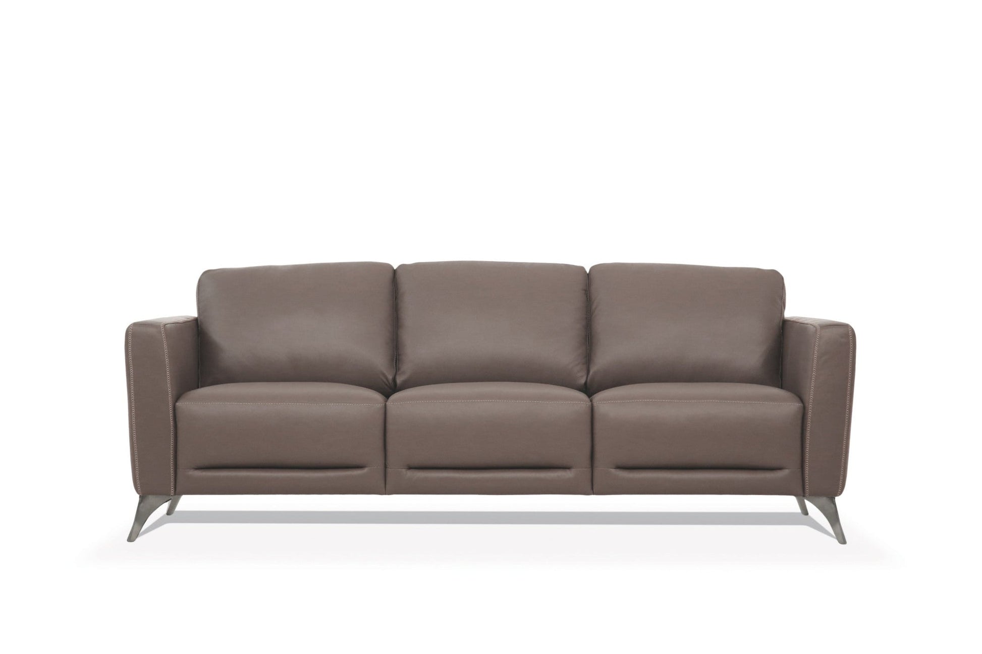A: Its luxurious taupe leather upholstery, elegant black legs, and sleek design offer a perfect combination of comfort and modern style, ideal for upgrading any living space.