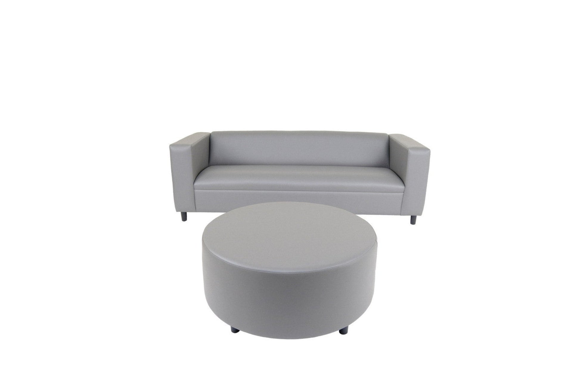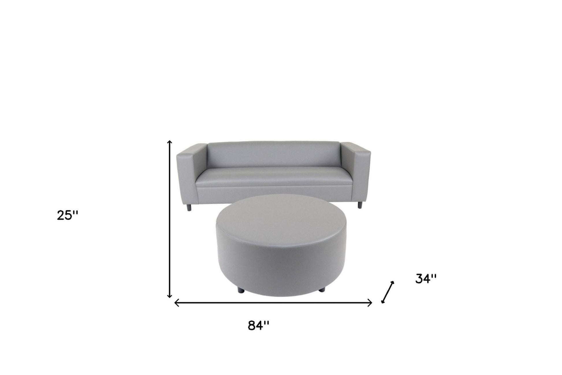 This 84-inch gray faux leather sofa with ottoman with black legs is made from sturdy and resilient vinyl that will look and feel like leather. Solid colors give you lots of decorative options and are easy to work into your decor scheme. Coil spring construction gives this piece strong support and makes it comfortable to sit even for long periods of time. A comfy ottoman is included as part of the package. Great to rest your feet or provide extra seating in a pinch. Square arms offer a comfy place to rest. Black solid wood legs effortlessly elevate the room and add a touch of contemporary design. Built to last, this sofa will be a great centerpiece for your room. 25-inch H x 84-inch W x 34-inch D