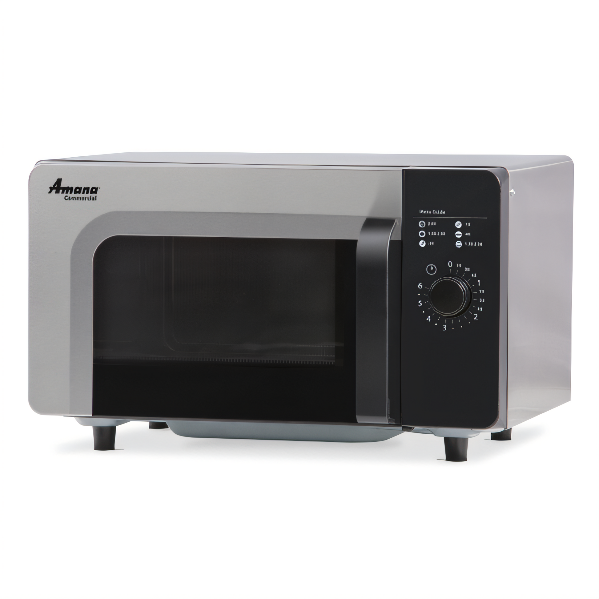 Amana Commercial Microwave Oven, 0.8 cu. ft. capacity, 1000 watts, low volume, single stage cooking, (1) power level, lighted control dial, 6-minute max cooking time, interlock safety switch, audible end of cycle signal, side hinged door with tempered glass, LED lighted interior, stainless steel interior & exterior, 120v/60/1-ph, 13.0 amps, 15 MCA, 1500 watts (total), cord, NEMA 5-15P, cETLus, ETL-Sanitation