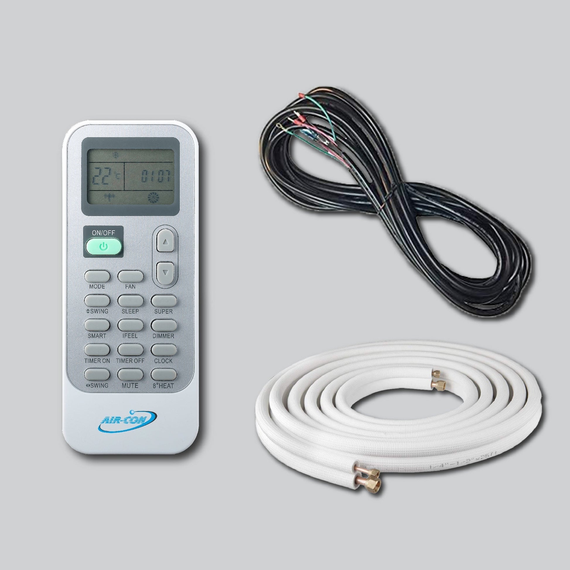 A: Includes the indoor unit, outdoor condenser, 15ft lineset, communication wiring, and remote control.