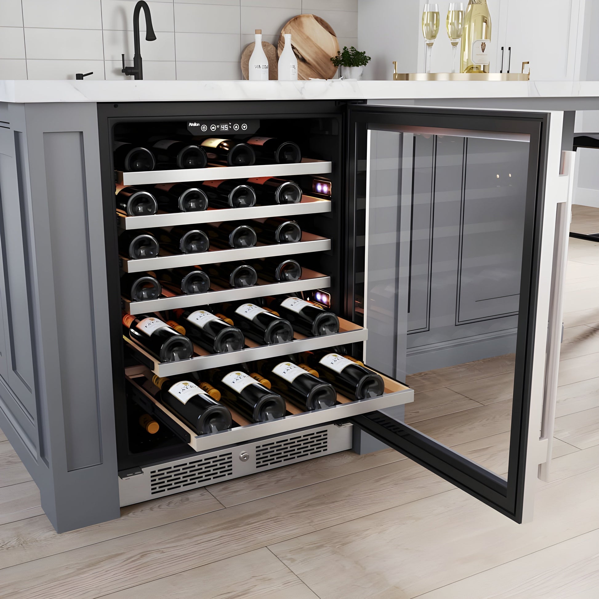A: A premium wine cooler with a 53-bottle capacity, single-zone cooling, and a right-swing door. Designed for wine collectors who want consistent temperature control in a stylish, high-performance unit.