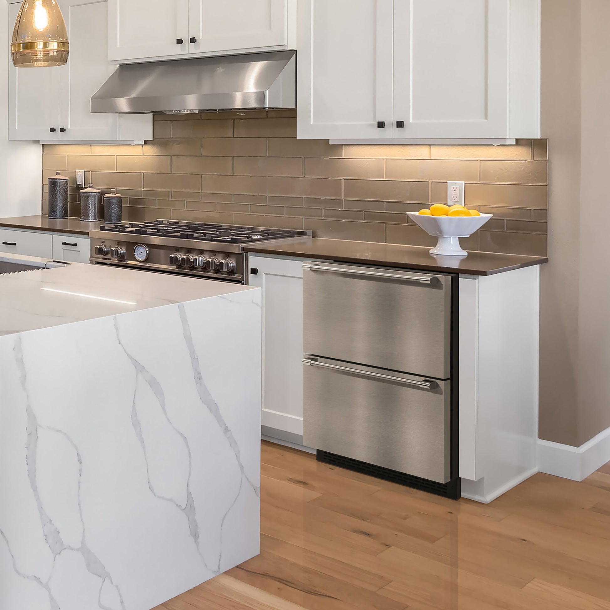 The Brama by Vinotemp Indoor/Outdoor Drawer Refrigerator and Freezer brings an element of class and elegance to any space. An easy-to-use digital control panel with blue LED readout right behind the top drawer door allows you to set the temperature of the two independent zones to ensure that drinks and more are stored properly. This unit features two gliding, solid drawers with stainless steel exterior and horizontal handles. It comes with a sturdy wire basket for the top (refrigerator) drawer, while the bottom (freezer) drawer contains a divider for convenient storage. This attractive Drawer Refrigerator & Freezer is designed to be a worthy home for all of your storing needs. The BR-24FZREF unit is designed for both indoor and/or outdoor installation. Covered by the Vinotemp One-Year Limited Warranty.The Brama Indoor/Outdoor Drawer Refrigerator & Freezer brings an element of class and elegance to any space. An easy-to-use digital control panel with blue LED readout right behind the top drawer door allows you to set the temperature of the two independent zones to ensure that drinks and more are stored properly. This unit features two gliding, solid drawers with stainless steel exterior and horizontal handles. It comes with a sturdy wire basket for the top (refrigerator) drawer, while the bottom (freezer) drawer contains a divider for convenient storage. This attractive Drawer Refrigerator & Freezer is designed to be a worthy home for all of your storing needs. The BR-24FZREF unit is designed for both indoor and/or outdoor installation.