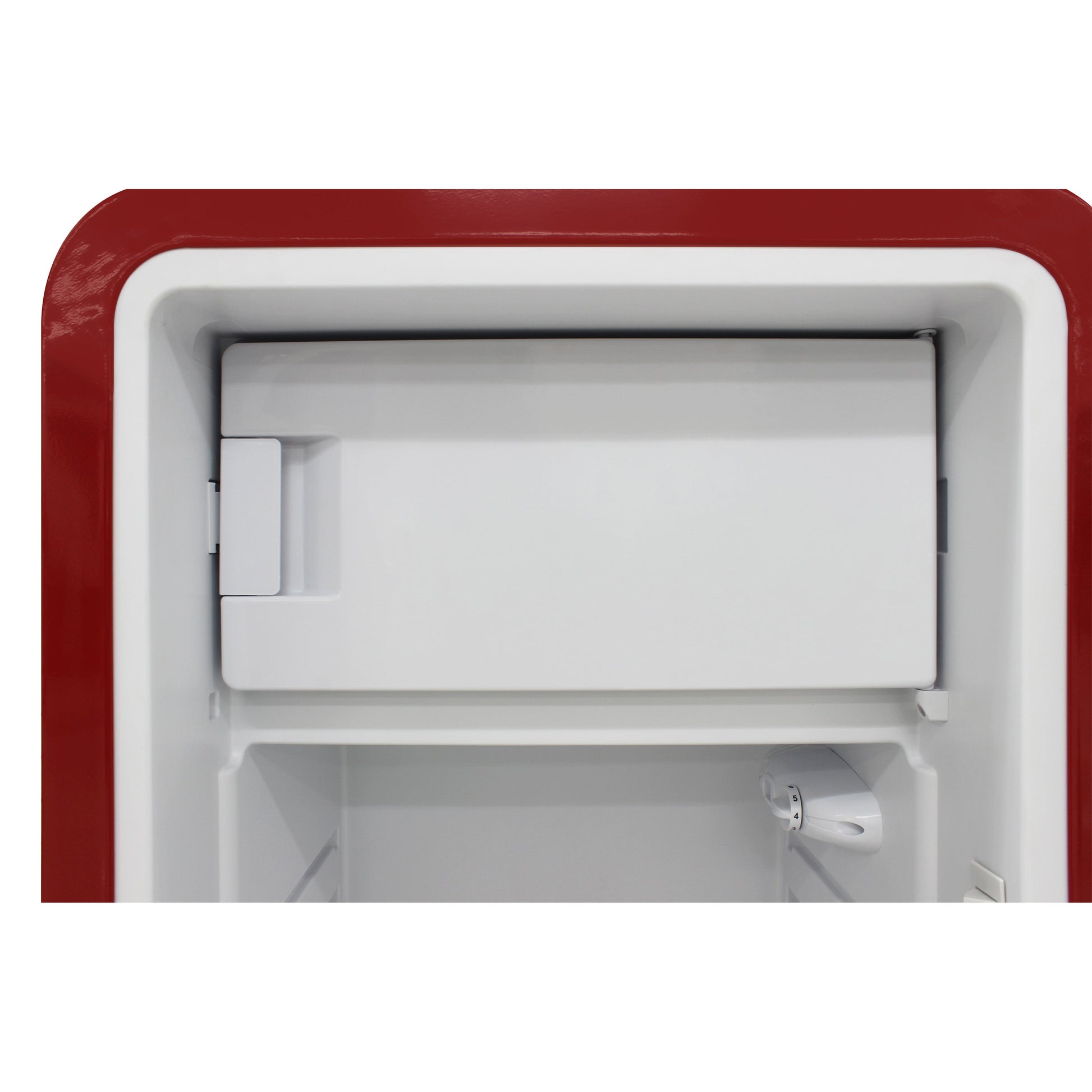 A: The refrigerator features a vibrant red, retro-inspired design, adding a bold and nostalgic touch to any kitchen or living area.