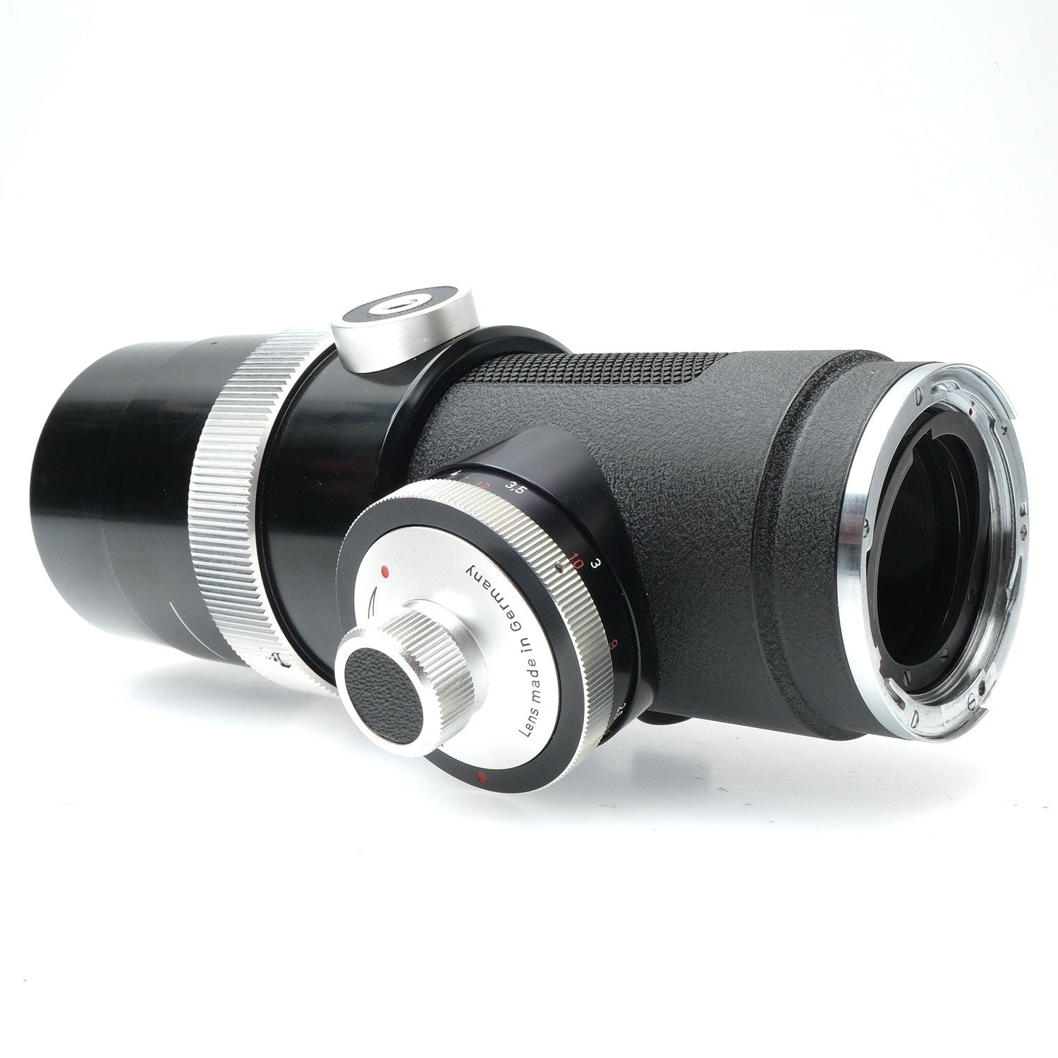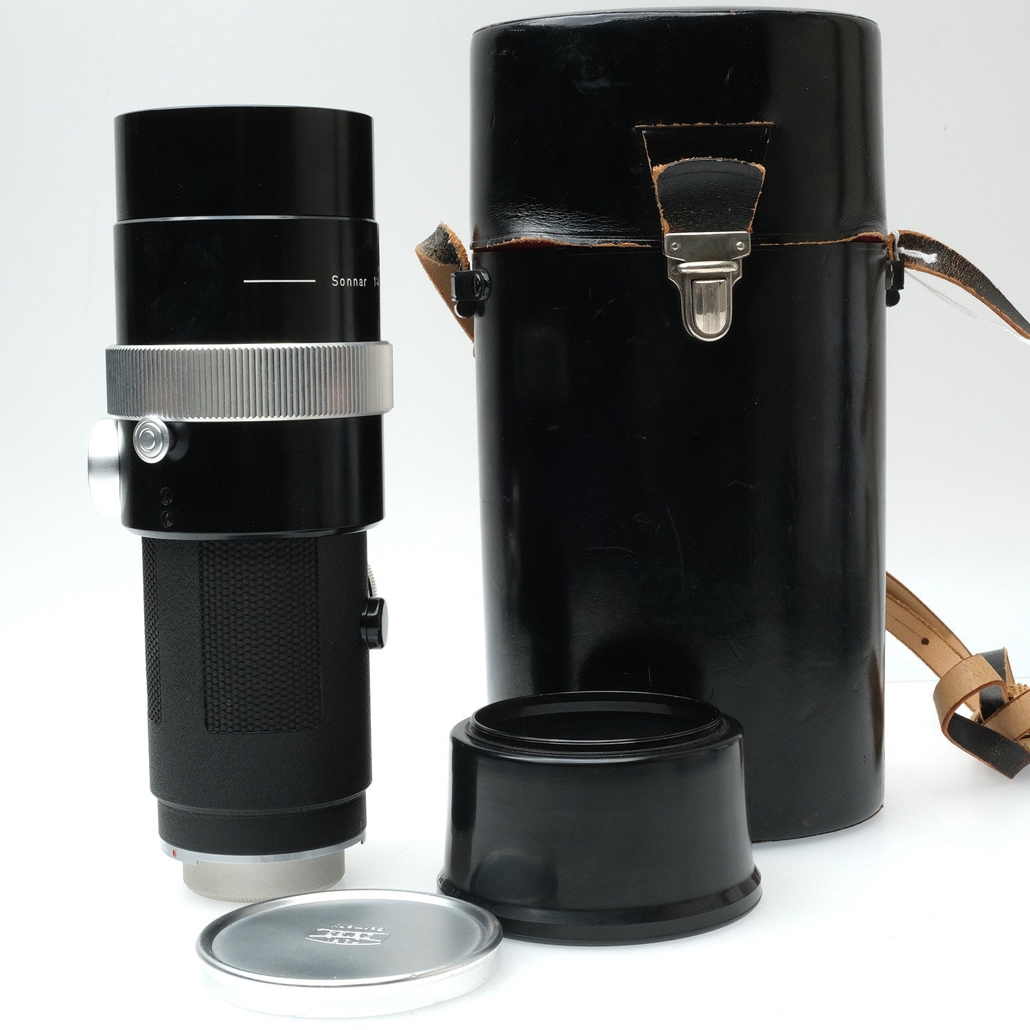 This Contarex 250mm f4 Olympia Sonnar Lens, #3878118, is in great condition with minor handling wear. I rate it cosmetically a (9). The focus wheel is smooth, the aperture functions properly, and the glass has no haze or fungus. There are some faint cleaning marks and specks of dust inside, but they do not affect image quality. This lens includes a leather Contax lens case, lens hood, a lens handle, and front & rear caps. Please refer to the photos for details.