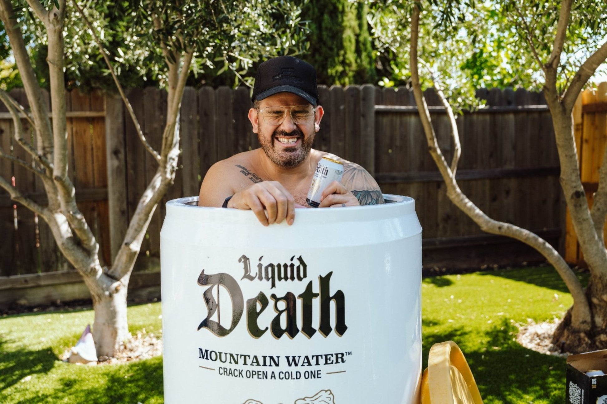 A: Features bold Liquid Death branding, an upright cylindrical design, and is built for extreme cold immersion.