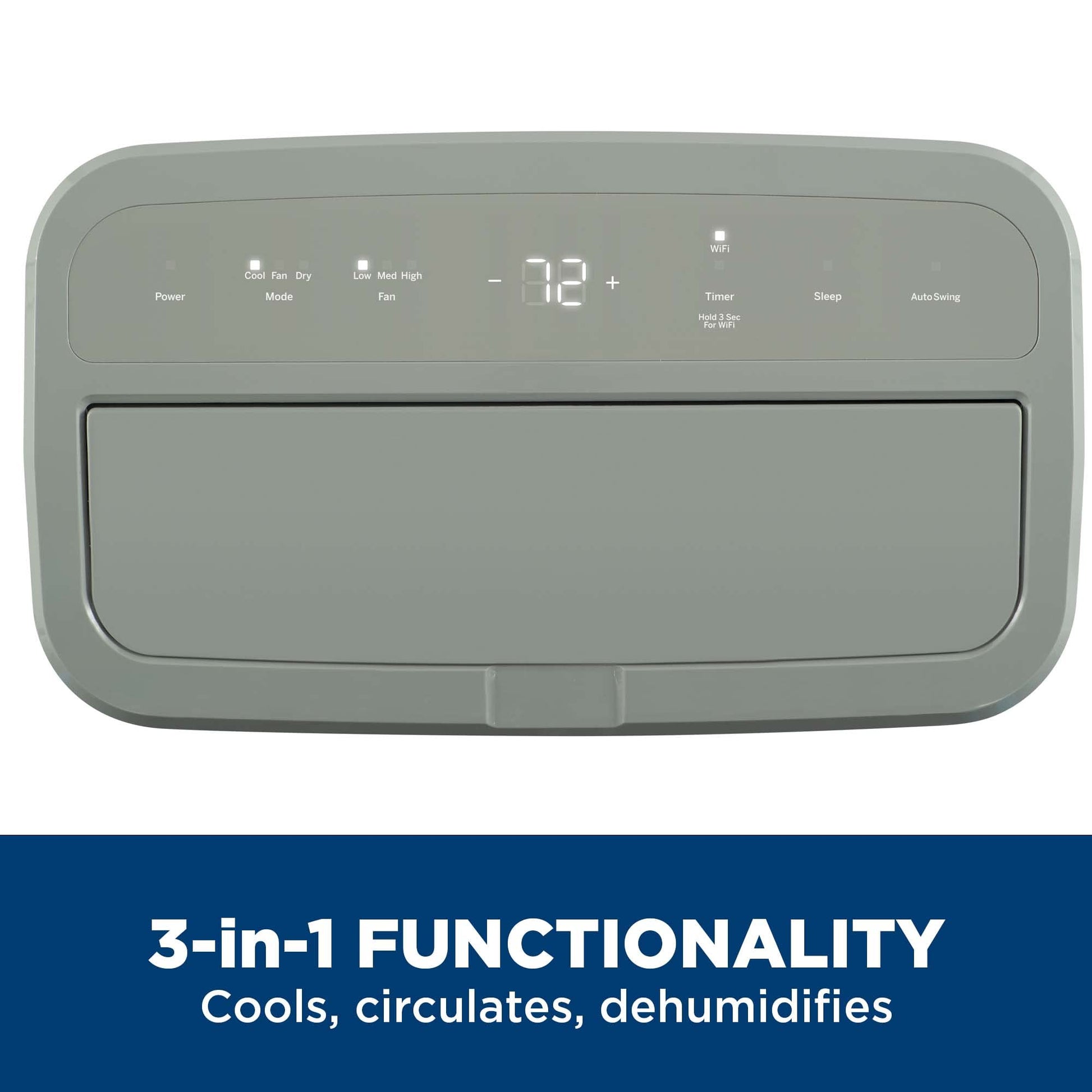 A: This 7,500 BTU portable air conditioner features built-in WiFi for smart control, a dehumidifier function, a remote control, and easy mobility for versatile cooling.