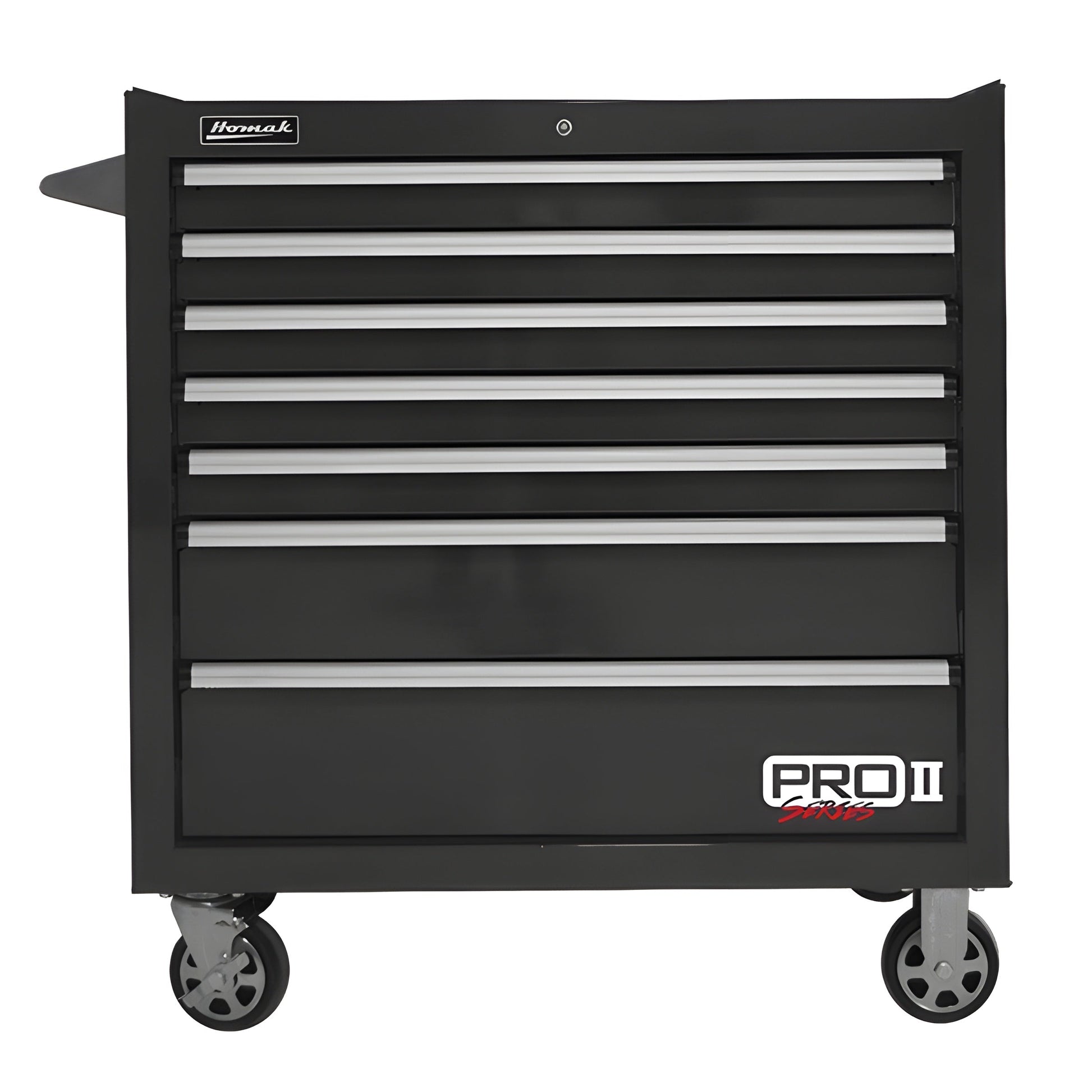 A: The Homak 36” Pro II Series 7 Drawer Roller Cabinet is 36 inches wide, offering a compact yet spacious storage solution for tools and equipment.