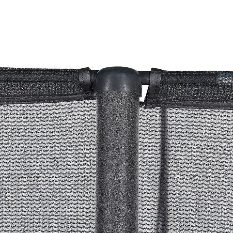 A: It features a durable safety enclosure, padded poles, and meets ASTM safety standards for a secure jumping experience.