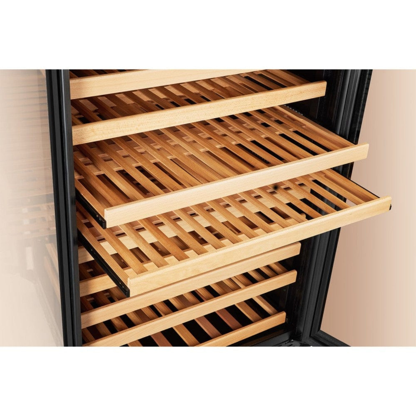 WOODEN SHELVES -Â 34 wooden beech shelves can accommodate up to 289 standard 750ml Bordeaux bottles. If you prefer to store Burgundy, Pinot Noir, or Champagne, simply remove 1-2 shelves. Storage capacity will be reduced for larger bottles.
