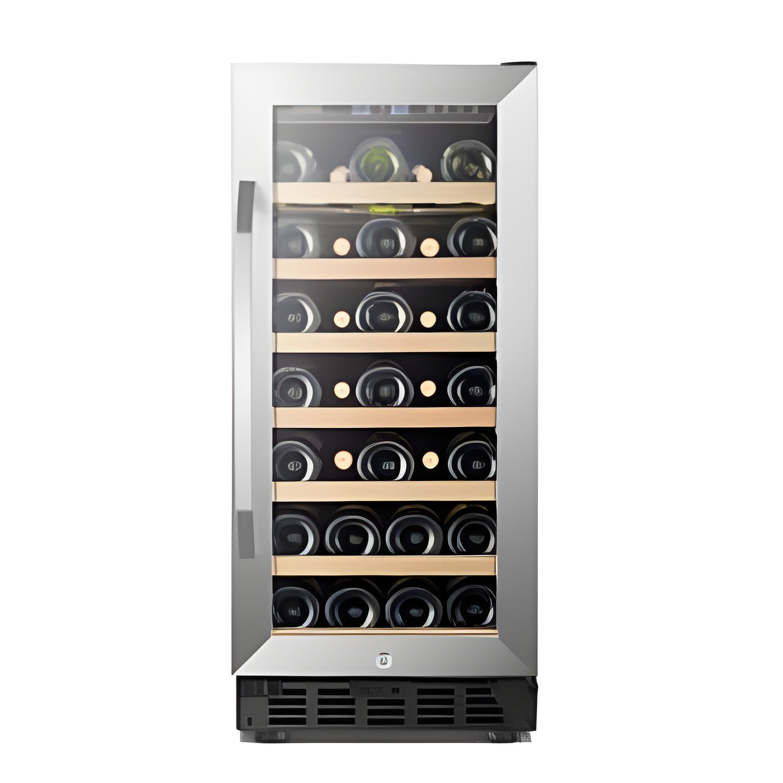 Elevate your wine storage experience with the Lanbo 33 Bottle Single Zone Wine Cooler. This sleek and compact wine cooler is designed to fit seamlessly into your home with its space-saving dimensions of 15 inches wide and 23.6 inches deep. Its efficient compressor, coupled with a double-paned tempered glass door, ensures energy efficiency while maintaining the perfect environment for your wine collection. Whether built-in or freestanding, the fan-forced front ventilation allows versatile installation options, making it a perfect addition to any kitchen or bar area.