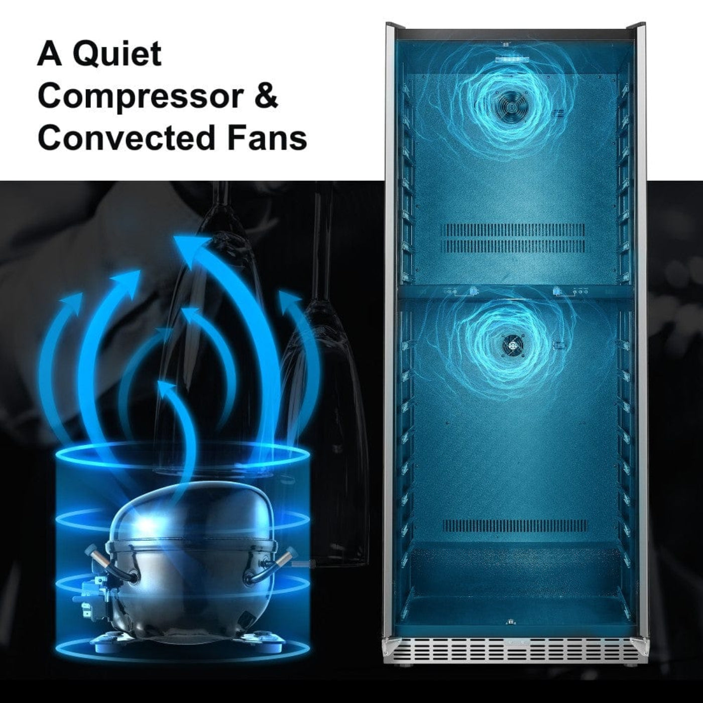 The key to enjoying a flavorful, robust glass of wine is to keep your collection in a space that maintains a consistent temperature to ensure integrity and flavor. This product is a luxurious and stylish black dual door single zone compressor wine cellar, ideal for collecting and storing up to 289 bottles of your favorite and most treasured wines. Featuring a whisper quiet fan, as well as a low vibration compressor, providing the perfect wines for your party or gathering without all the noise. Soft internal LED lighting allows you to display your collection on beautiful wood shelves that easily slide out for easy access to your desired wine.