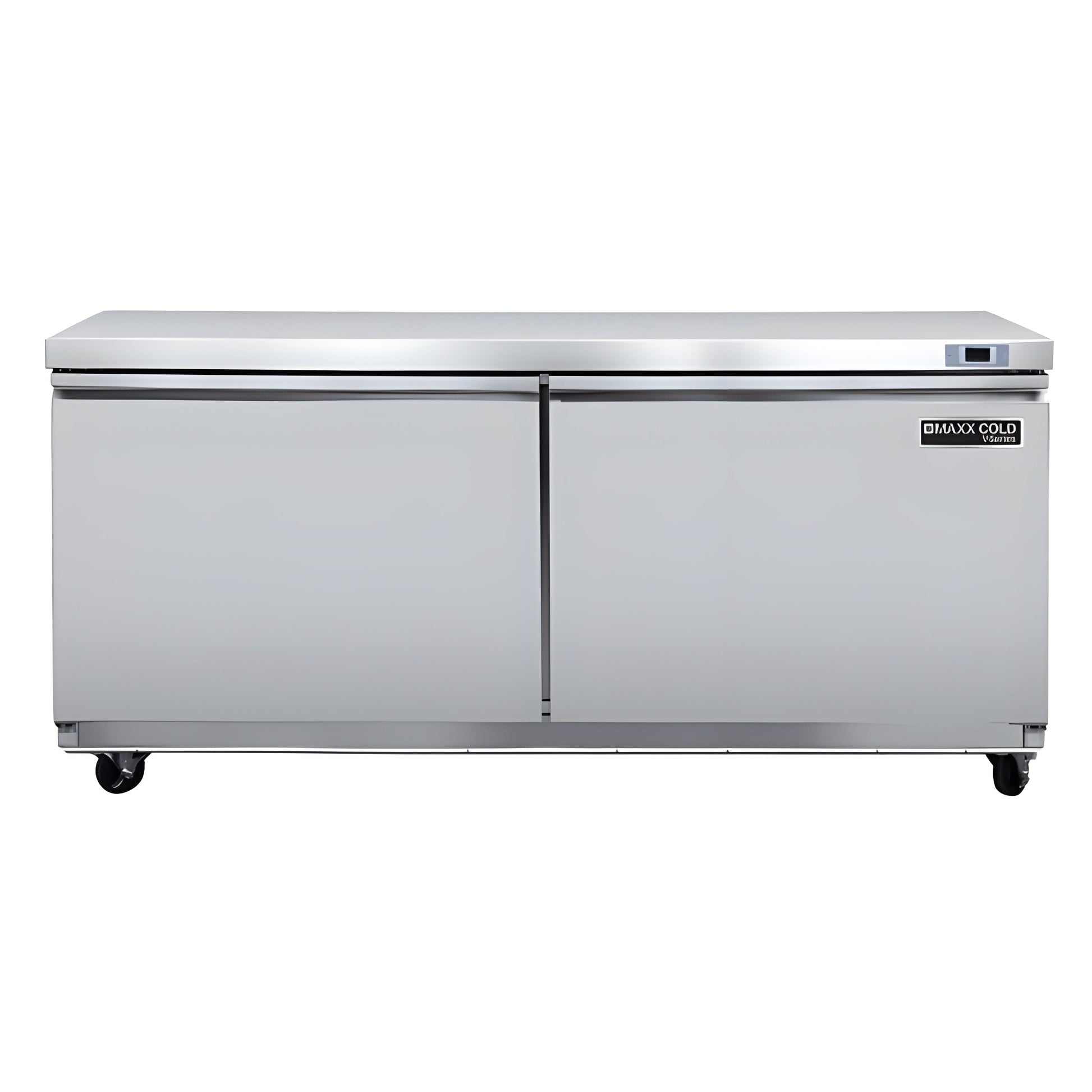 The Maxx Cold V-Series 2 Door Undercounter Freezer provides convenient frozen storage without sacrificing valuable floor space in your commercial kitchen. This compact undercounter freezer features a stainless steel exterior and powder coated aluminum interior for durability and ease of cleaning. Measuring 60 inches wide, it offers 18.5 cubic feet of storage and has two doors with easy-to-grip recessed handles. This stainless steel undercounter freezer has two adjustable heavy-duty wire shelves for storing and organizing frozen foods and ingredients such as meat, desserts, seafood and more. With its compact size, this commercial undercounter freezer easily fits under counters and other workspaces, making it ideal for kitchens with limited space. The unit includes four 3" swivel casters (two with brakes) for easy mobility and cleaning. Additional features include a solid state digital control system, LED temperature display, and urethane foam insulated walls and doors. The unit has a temperature range of 0°F to 10°F to hold your frozen products at their ideal storage conditions. The condensate evaporator is integrated to the unit, meaning no drain line connection is needed. The Maxx Cold V-Series 2 Door Undercounter Freezer offers quick access to frozen ingredients, making it a valuable addition for restaurants, pizzerias, bars, bakeries, cafes and more. Covered by the Maxx Cold Six-Month Limited Warranty.