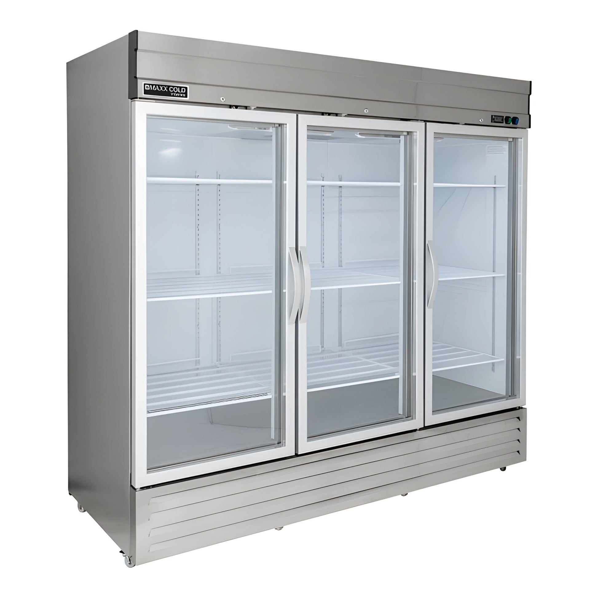 Ideal for showcasing your goods in restaurants, cafes, bakeries, catering businesses and more, the Maxx Cold V-Series 3 Glass Door Reach-In Refrigerator is a smart investment. Offering ample storage space for perishable goods, ingredients, prepared foods and beverages, this commercial reach-in refrigerator measures 81"W and has a storage capacity of 65 cubic feet. Built to withstand the demands of a commercial kitchen environment, it is constructed of a durable, easy-to-clean stainless steel exterior and painted aluminum interior. This reach-in refrigerator has three self-closing, locking, dual-pane glass doors with easy-to-grip handles, and the unit's open door alert beeps when the door has been open for three minutes. The transparent doors create an attractive display that enhances product visibility, promotes impulse purchases and makes it easier to locate items. Twelve adjustable heavy-duty wire shelves let you efficiently organize and store food and beverage items. The unit has an easily accessible bottom mount for cleaning and is equipped with 4-inch swivel casters for easy mobility in your commercial kitchen. The digital control system lets you easily adjust the temperature with the range of 34°F to 40°F (1°C to 4°C), and the LED temperature display is easy to read. This triple-door reach-in refrigerator features automatic interior lighting, an automatic defrost system and urethane foam insulated walls. The unit is equipped with an integrated condensate evaporator; therefore, no drain line connection is needed. Investing in the Maxx Cold V-Series 3 Glass Door Reach-In Refrigerator is a practical and essential decision for businesses in the foodservice industry. Covered by the Maxx Cold Six-Month Parts and Labor Limited Warranty.