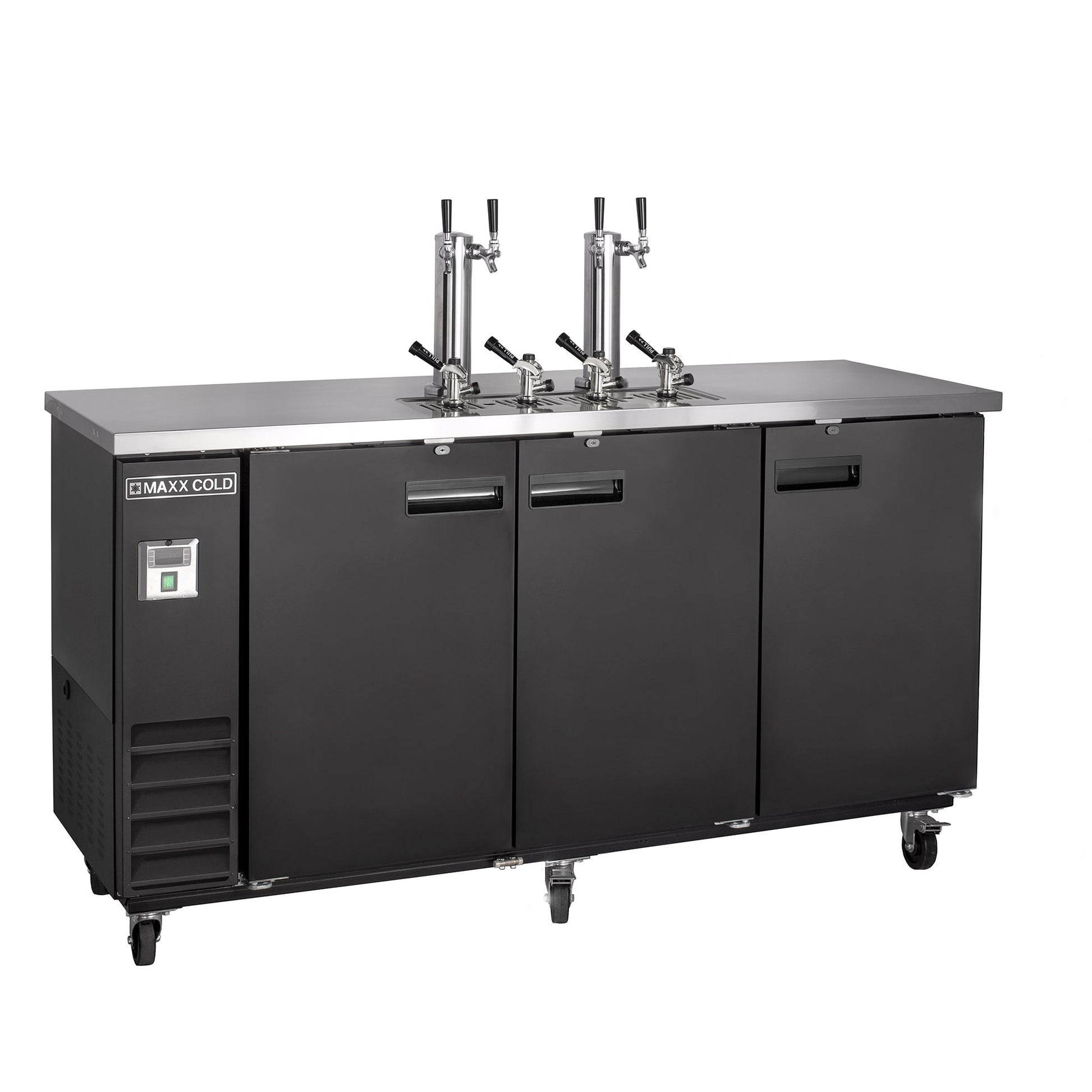 This 73 inch wide Maxx Cold X-Series Beer Tower Dispenser is engineered for durable usage, efficient performance, and easy cleaning. It accommodates 3 barrel/keg, providing up to 17.3 cubic feet (490L) of storage capacity. This beer tower is equipped with two 3â (77mm) diameter stainless steel insulated beer tower dispensers which can accommodate for two different liquids. This tower beer dispenser is ideal for pubs, bars, breweries, catering services, banquet halls or special events and parties requiring a draft brew. The exterior of the unit is constructed of black powder-coated steel topped with stainless-steel, while the interior of the cabinet is crafted in sanitary white coated steel paired with a stainless floorplate. This unit is fully insulated with 2â (50 mm) CFC-free polyurethane on both walls and doors. The standard 3-inch (77 mm) polished stainless-steel draft tower dispensers, which are mounted to the top center counter, are cooled by continuous cold air circulation to maintain tap temperature that reduces foam when dispensing and can easily fill pint beer glasses, frosted beer mugs and pitchers. Premium features on this model include a self-contained forced air refrigeration system which cools the base cabinet and tower to optimize temperature throughout your commercial operations. The solid-state digital control system is designed with LED temperature display.  This beer tower dispenser is engineered to facilitate maintenance and maneuvering by the operator, with an easy to clean slide-out condensing unit, recessed drawer handles (with locks) and four (4) swivel casters (two of which come with brakes). The dispenser is equipped with integrated condensate evaporator, meaning no drain line connection is needed. Operation requires CO2 tank and regulator (notâŻincluded).