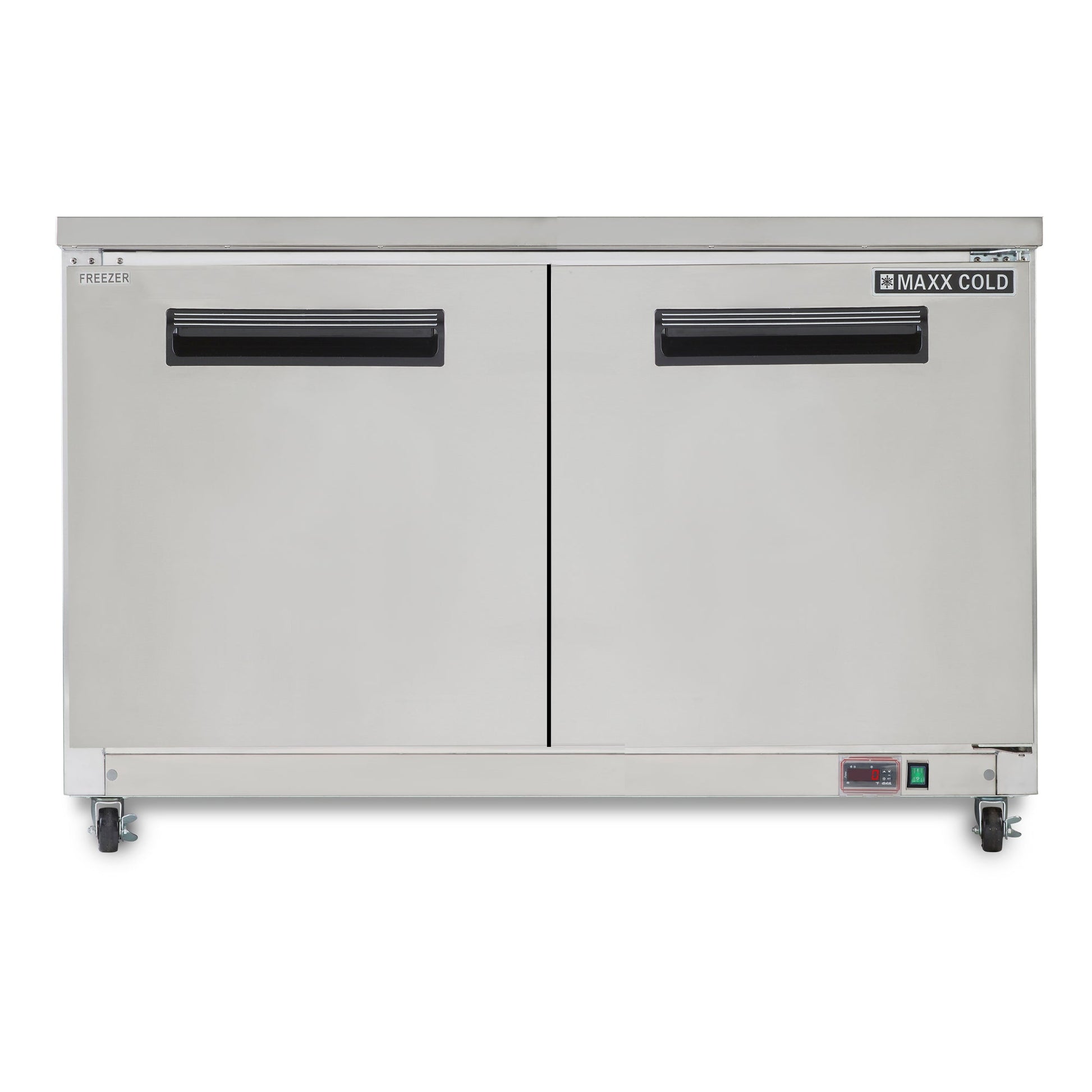 Designed to provide maximum storage, energy savings and cold, accurate temperatures, the Maxx Cold Double Door Undercounter Freezer is ideal for food storage needs in commercial settings. This two-door undercounter freezer provides easy accessibility, optimum capacity and flexibility for quick and efficient food preparation. Made of a durable, easy-to-clean stainless steel exterior and interior, this compact freezer features 12 cubic feet of storage space and two doors with easy-to-grip recessed door handles. Each section includes an adjustable heavy-duty wire shelf to organize your food, beverages and ingredients. The unit is equipped with four, 3-inch swivel casters for easy maneuverability in tight spaces. This compact freezer is engineered with a digital temperature display, which can be viewed from outside the cabinet. This unit is equipped with an integrated condensate evaporator, meaning no drain line connection is needed. This two-door undercounter freezer is engineered with urethane insulation, which provides outstanding thermal regulation for energy efficiency. Ideal for a variety of settings, including cafes, snack bars, concession stands and more, the Maxx Cold Double Door Undercounter Freezer is a wise choice for your frozen food storage needs.