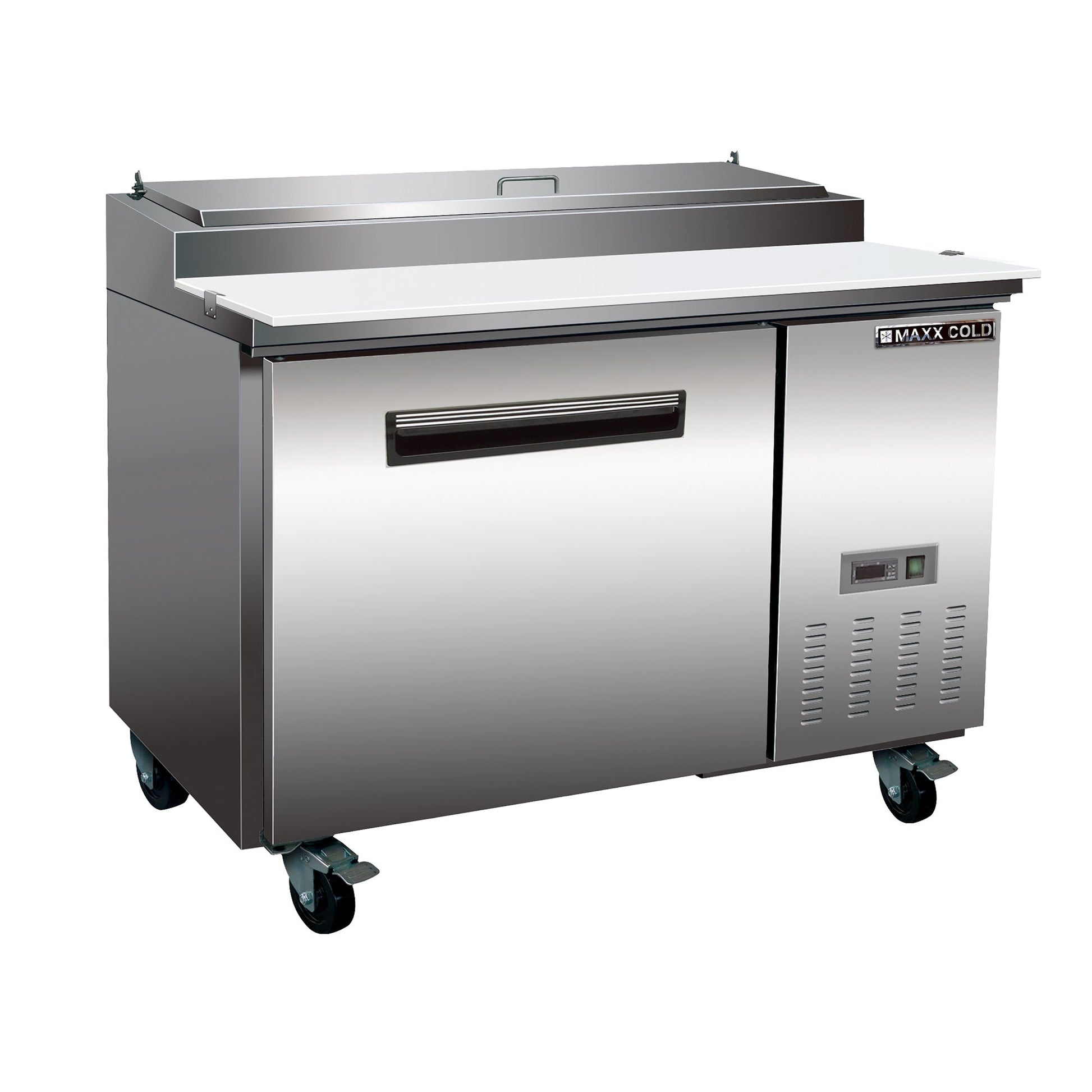 Maxx Cold commercial refrigerated pizza prep table allows for easy accessibility, optimum storage capacity and flexibility for quick and easy food preparation. The one-door model offers up to 12 cubic feet (340 L) of storage, accommodates 6 pans and can hold full-size sheet pans. It has plenty of storage & preparation space for culinary ingredients, garnishes and pizza toppings. The durable construction of stainless steel is designed with easy grip recessed handles, LED temperature display and is equipped with sanitary food grade quality 17.75” deep polyethylene cutting board to efficiently accommodate commercial food preparations. This 47.4” wide refrigerated pizza prep cabinet features adjustable heavy-duty wire shelves (1 per section/door), a full set of clip-on divider bars and 4” deep plastic pans. This energy efficient unit is engineered with urethane foam insulated walls and doors. Additionally, it features a solid-state digital control system, LED temperature display and an integrated condensate evaporator which means that no drain line connection is needed. This one-door commercial pizza prep table is equipped with four 3” diameter swivel casters (two with brakes) for easy maneuvering when needed. The eco-friendly refrigeration system utilizes R290A hydrocarbon refrigerant to maintain optimum temperatures from 33 to 41 degrees Fahrenheit or 1 to 5 Celsius.