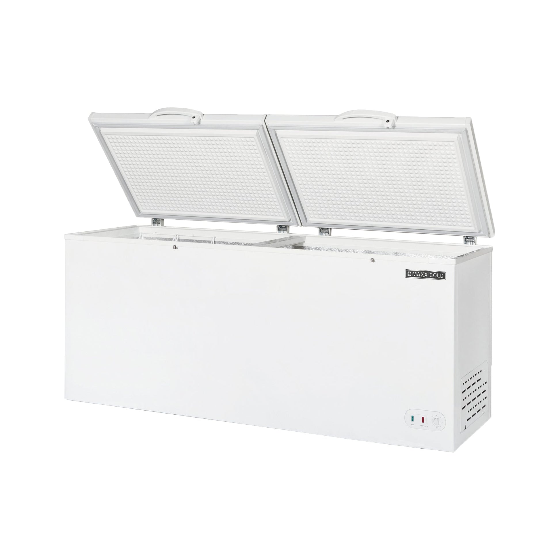 - Features: Maxx Cold Select Series Chest Freezer, 23.6 cu. ft., -11.2°F to -1°F temperature range, manual defrost, exterior temperature display, (2) solid hinged locking lids, (2) wire storage baskets, aluminum interior, white powder coated steel exterior, adjustable feet, self-contained refrigeration, R290a Hydrocarbon refrigerant, cETLus, ETL-Sanitation