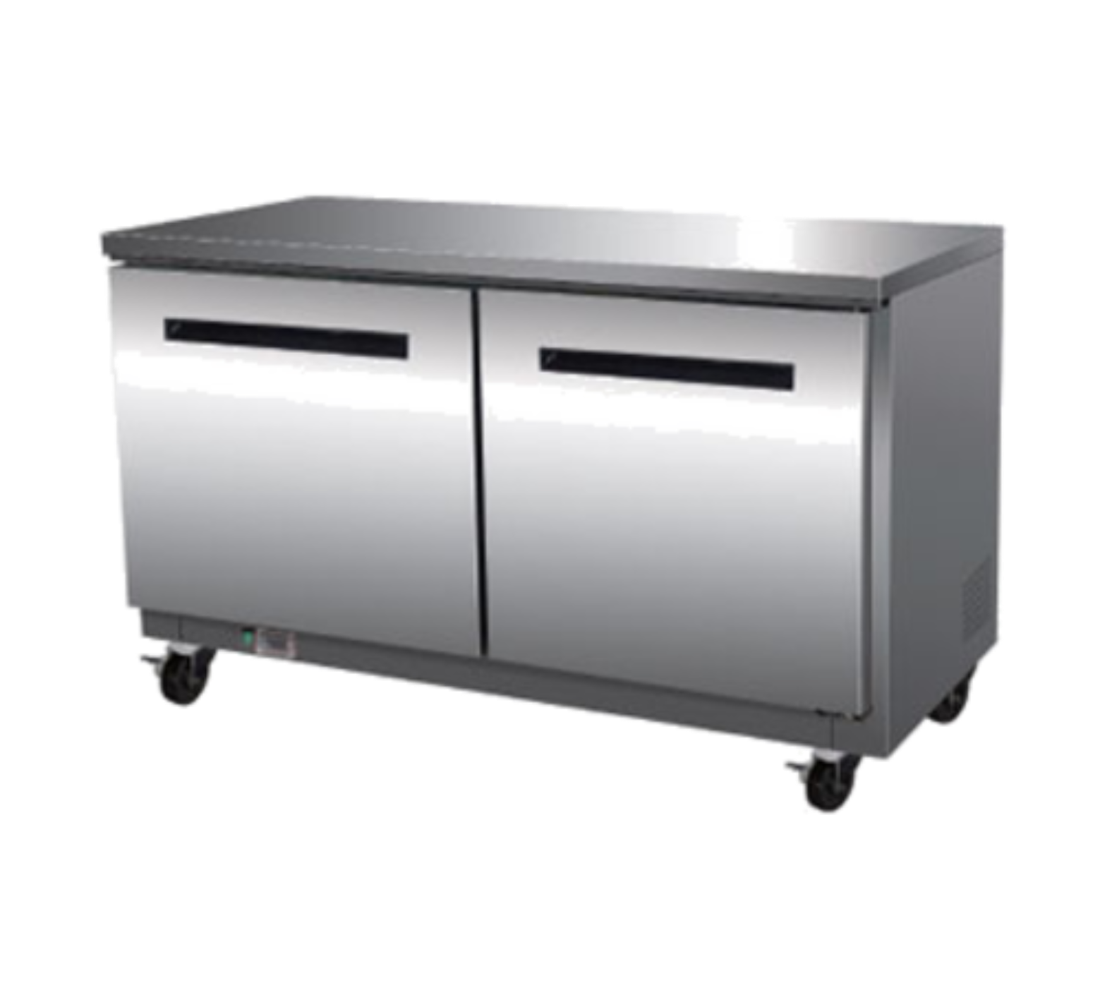 | Specifications | Maxx Cold X-Series 48" Undercounter Freezer, 12 cu. ft. storage capacity, two-section, (2) adjustable shelves, (2) solid hinged doors with recessed handles, electronic thermostat with digital LED temperature display, automatic defrost, stainless steel exterior, painted aluminum interior, (4) casters (2 locking & non-locking), R404A refrigerant, 1/2 HP rear-mounted compressor, cULus, UL EPH Classified |