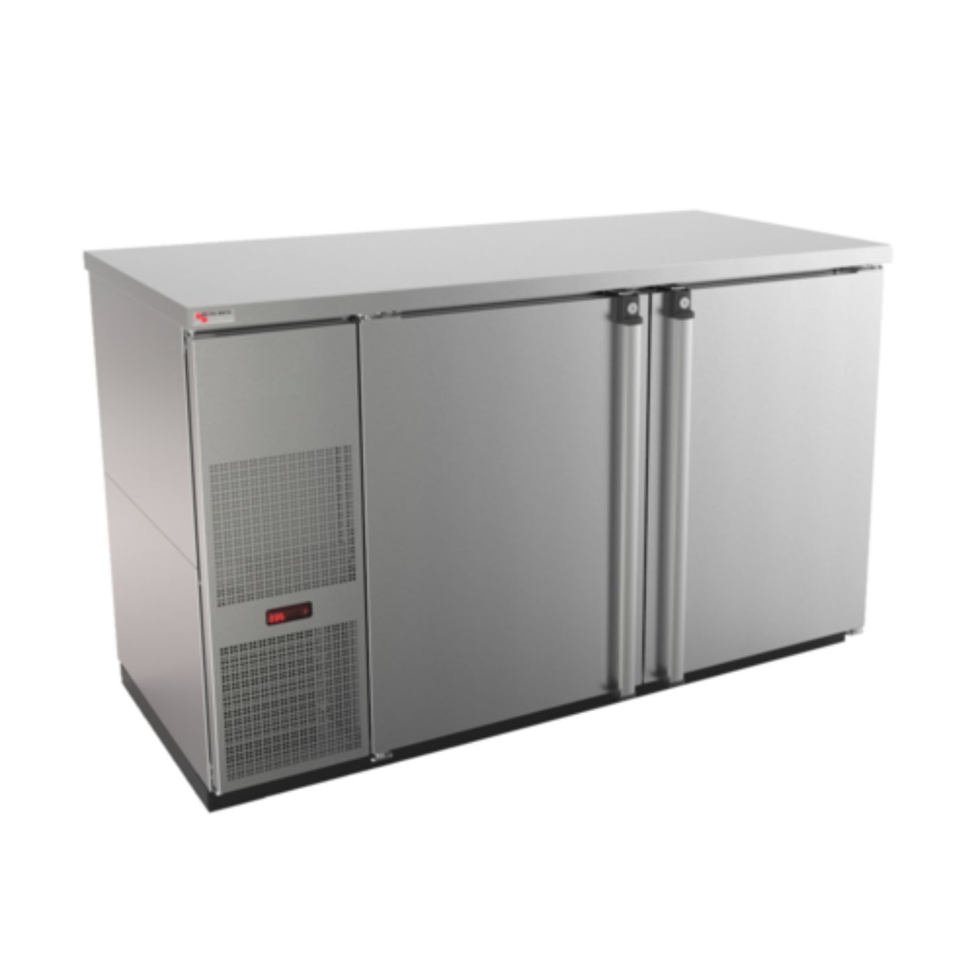 Pro-Line E-Series Refrigerated Back Bar Cabinet, two-section, 59-1/2"W, self-contained refrigeration, (23.7) cu ft. interior capacity, (2) solid hinged doors with locks, (2) flat shelves & (2) divider shelves, adjustable digital thermostat, interior lighting, front ventilated, automatic condensate evaporator, stainless steel interior walls & floor, stainless steel top & exterior, R290 Hydrocarbon refrigerant, 1/3 HP, 115v/60/1-ph, 3.0 amps, 8' cord, NEMA 5-15P, cETLus, ETL-Sanitation