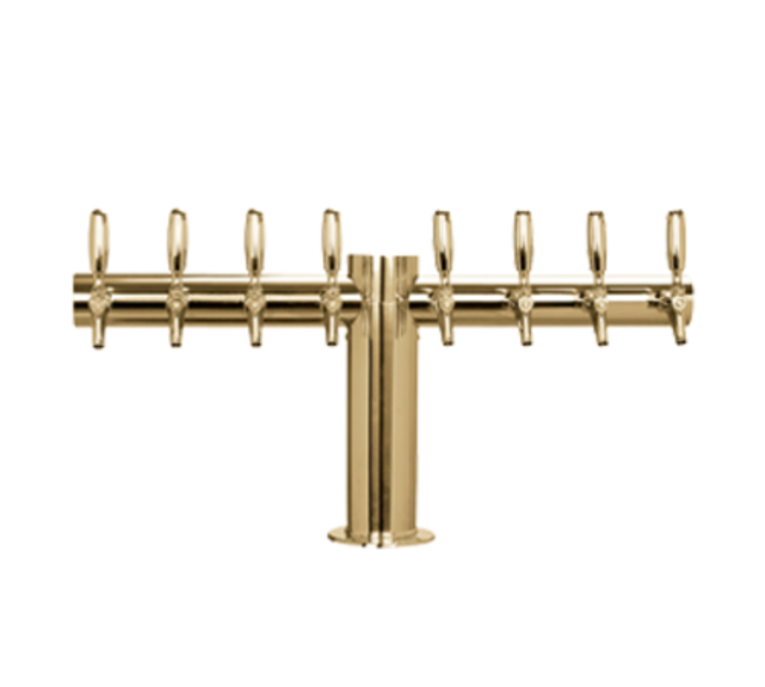 Metropolis "T" Draft Beer Tower, countertop, 34"W x 16"H, glycol-cooled (Kool-Rite™ integrated module), (8) PVD brass-plated stainless steel faucets (handles not included), 4" OC, 12" faucet clearance, 304 stainless steel product lines & leak-proof shanks, includes cooling block & copper coolant lines, mounting gaskets & hardware provided, 4" dia. column with 6" dia. base, PVD brass finish, NSF