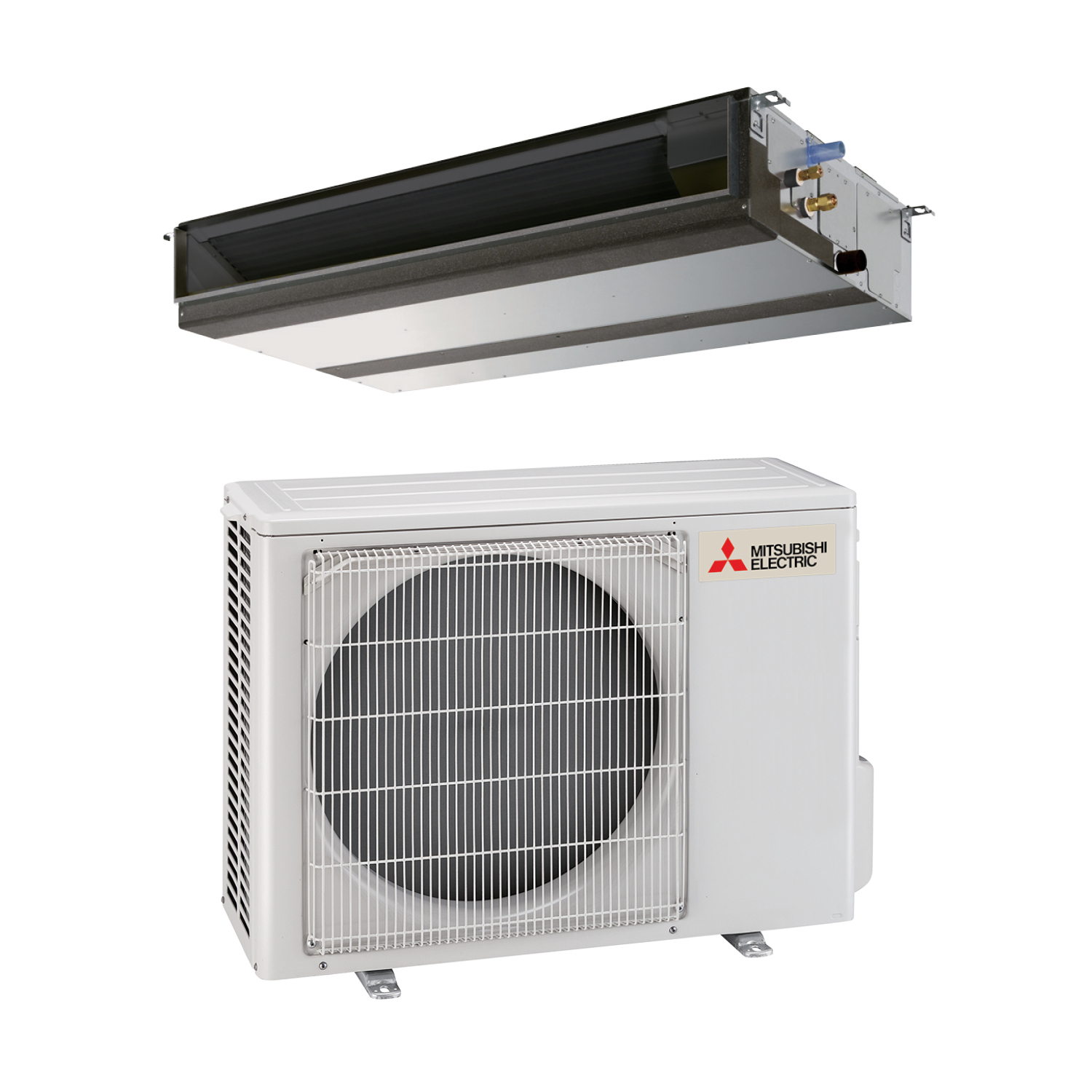 The Mitsubishi 12,000 BTU horizontal ducted single zone heat pump (PEAD-A12AA9 & PUZ-KA12NKA7) is an extremely efficient heating and cooling option that can fit in a limited space while still providing amazing comfort. This quiet beast of a single zone is built for residential homes, retail shopping centers, larger classrooms, office complexes, conference rooms, ballrooms, fitness centers, and more.