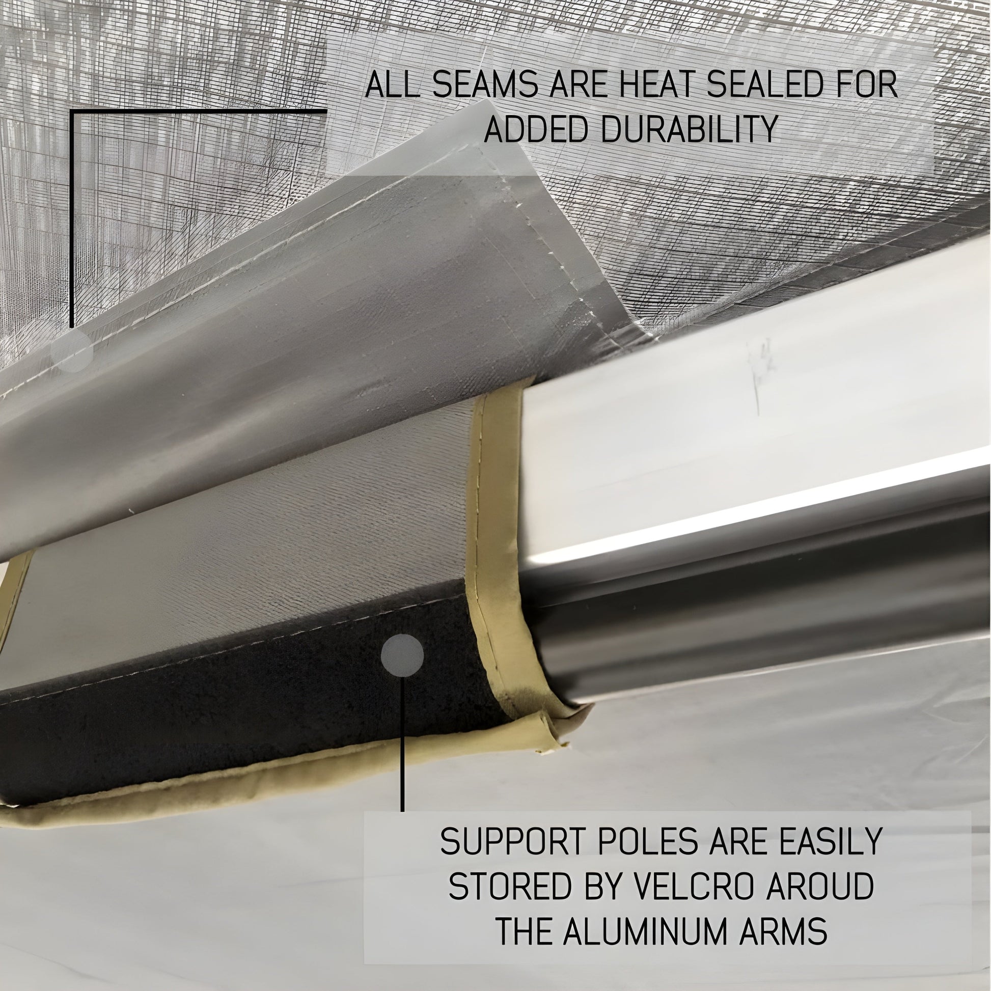 For extreme weather conditions, the three sidewalls can be added to turn the awning into a shelter enclosure for additional protection against the elements. When not in use, the awning can be quickly rolled up and stowed in the included 1000G PVC cover.