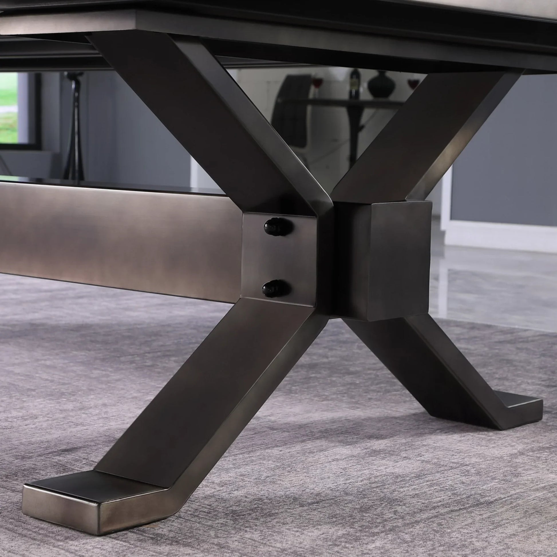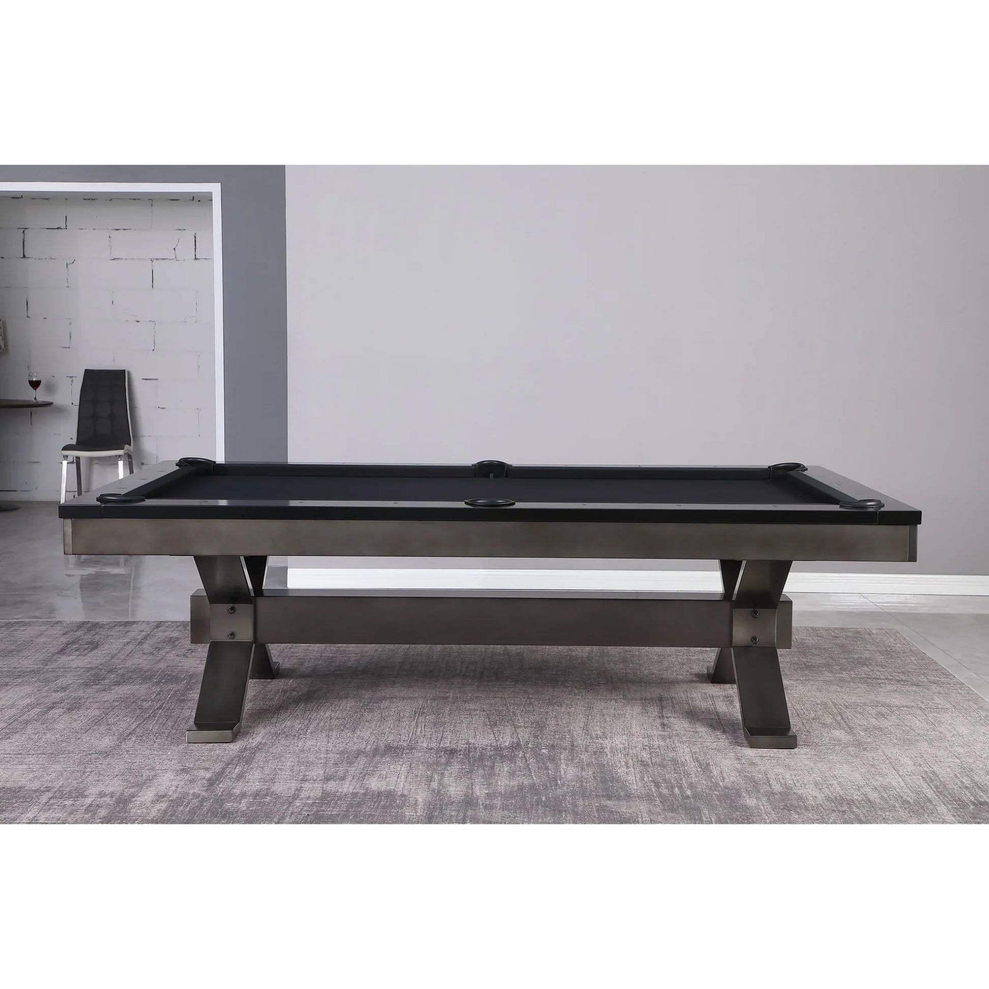 Bold 8-foot pool table with a sleek gunmetal steel frame and clean modern lines.