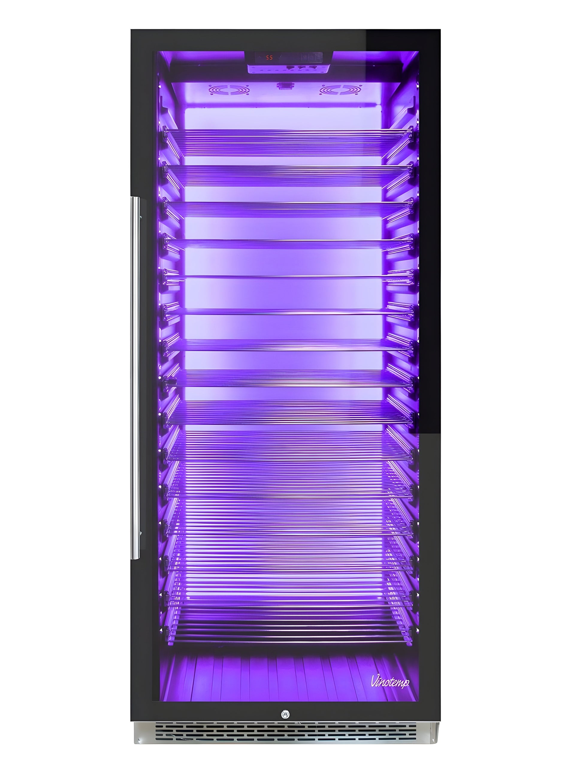 Vinotemp's Private Reserve Series 188-Bottle wine cooler has innovative features such as telescopic shelves, label forward wine bottle display, interior Backlit in three different colors, and LED side lighting to maximize your display capability. This Vinotemp wine refrigerator is front venting with easy installation to build in and fit perfectly in any kitchen or bar area. The commercial style wine cooler is an entertainer's delight with three different color options to display whatever mood fits. The design forward wine cooler features vibration-damping design to better protect its contents and is engineered for low energy consumption and low noise. Its patented interior Backlit panel has three different options - Heliotrope, Amber, and Vinotemp BioBlu (which helps reduce the growth of bacteria and mold) - and can be selected at any give time. Adjustable temperature range allows users to select a proper, customized storage and serving temperature for light or darker wines. Sturdy, stylish patented label forward VinBo Racks cradle bottles so the labels of wine stored are front facing while the racks glide and extend forward, adding to the cooler's visual appeal and function. A digital LED temperature display makes temperatures easy-to-read and ensures wine is being stored and served at the appropriate temperature.