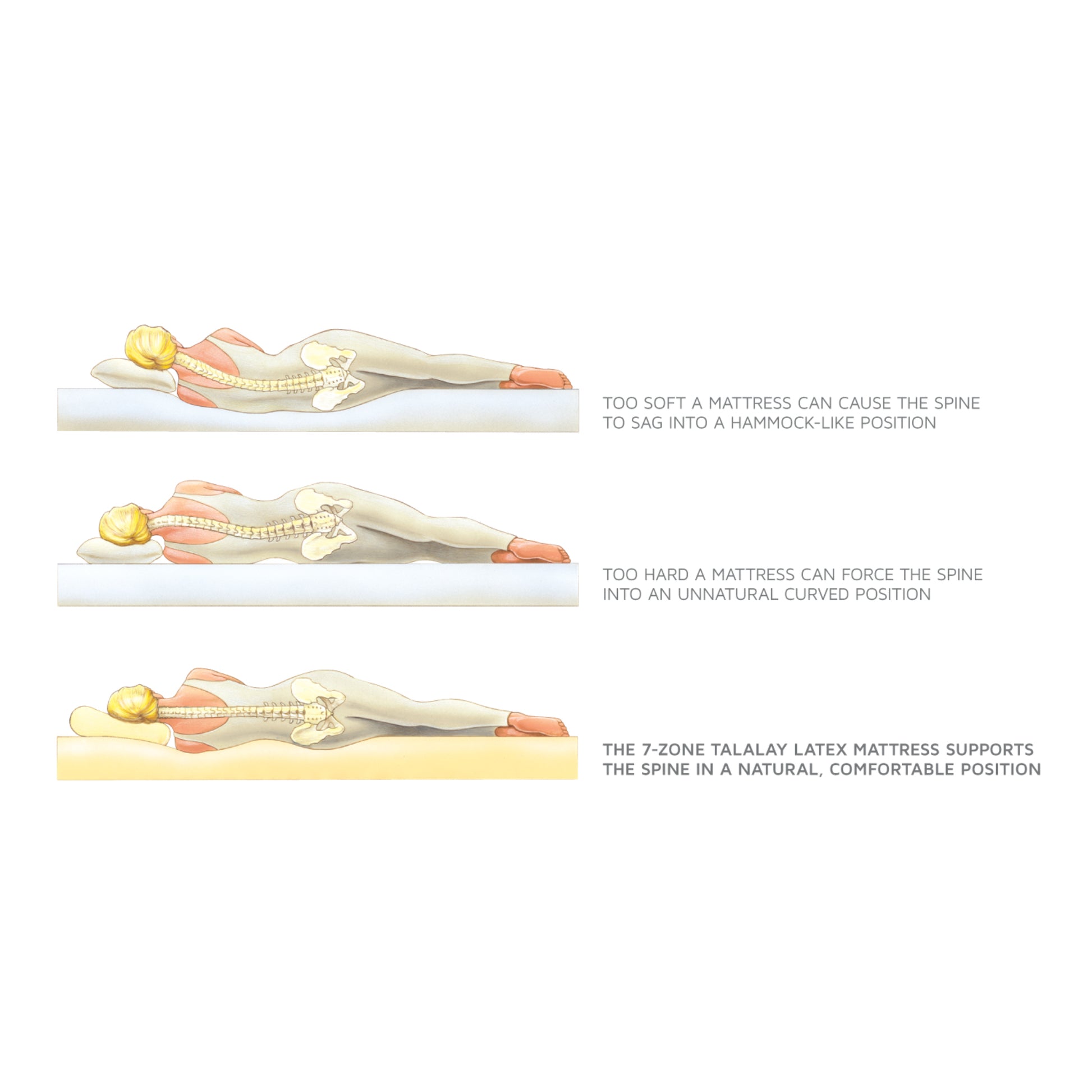The 7-Zone design Talalay latex core was developed by a sleep doctor in Switzerland, and is made in the Netherlands providing more suppleness to shoulders and hips, while maintaining bouyancy for lower back support.