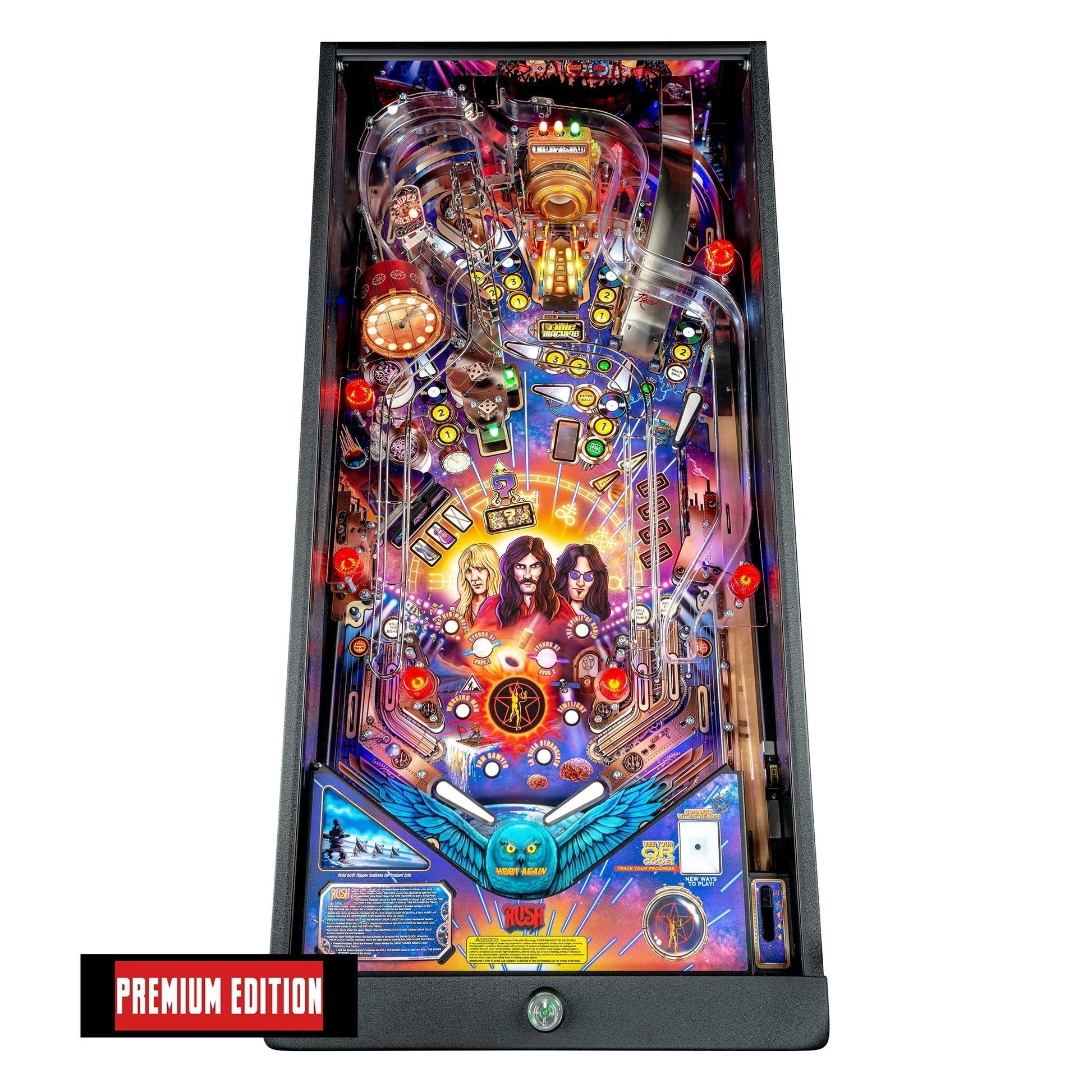 Travel back in time with Rush by shooting pinballs through a custom sculpted, electromagnetic Time Machine. Players will explore Red Barchetta, Subdivisions, and Fly By Night Multiball action. The Rush Premium and LE model pinball experience includes a motorized ramp with custom lighting effects and a custom sculpted Clockwork Angels Clock, inspired from Neil Peart’s bass drum from their Time Machine Tour. This motorized clock illuminates, and when it strikes midnight players will be transported to a Headlong Flight Multiball frenzy.