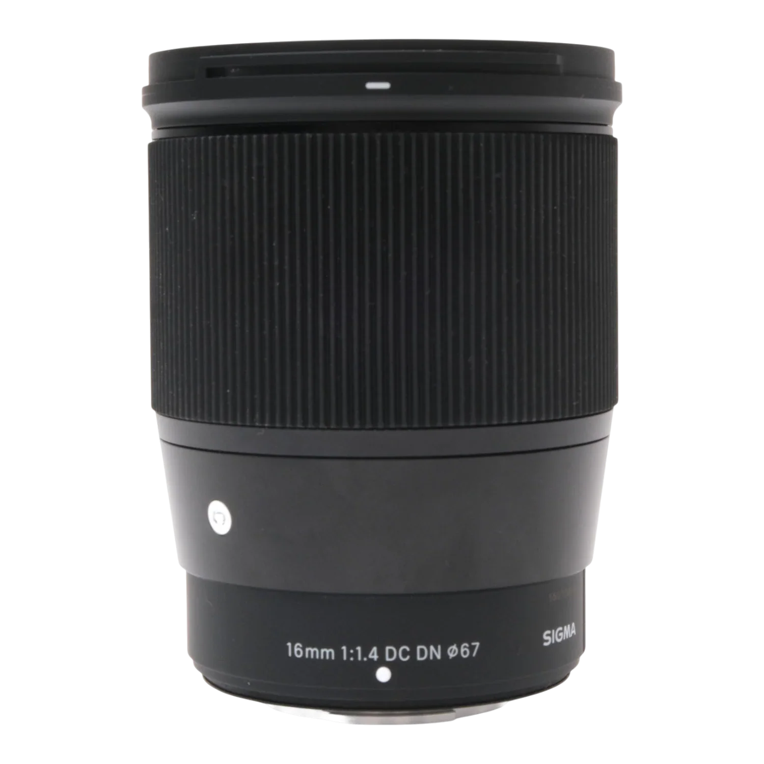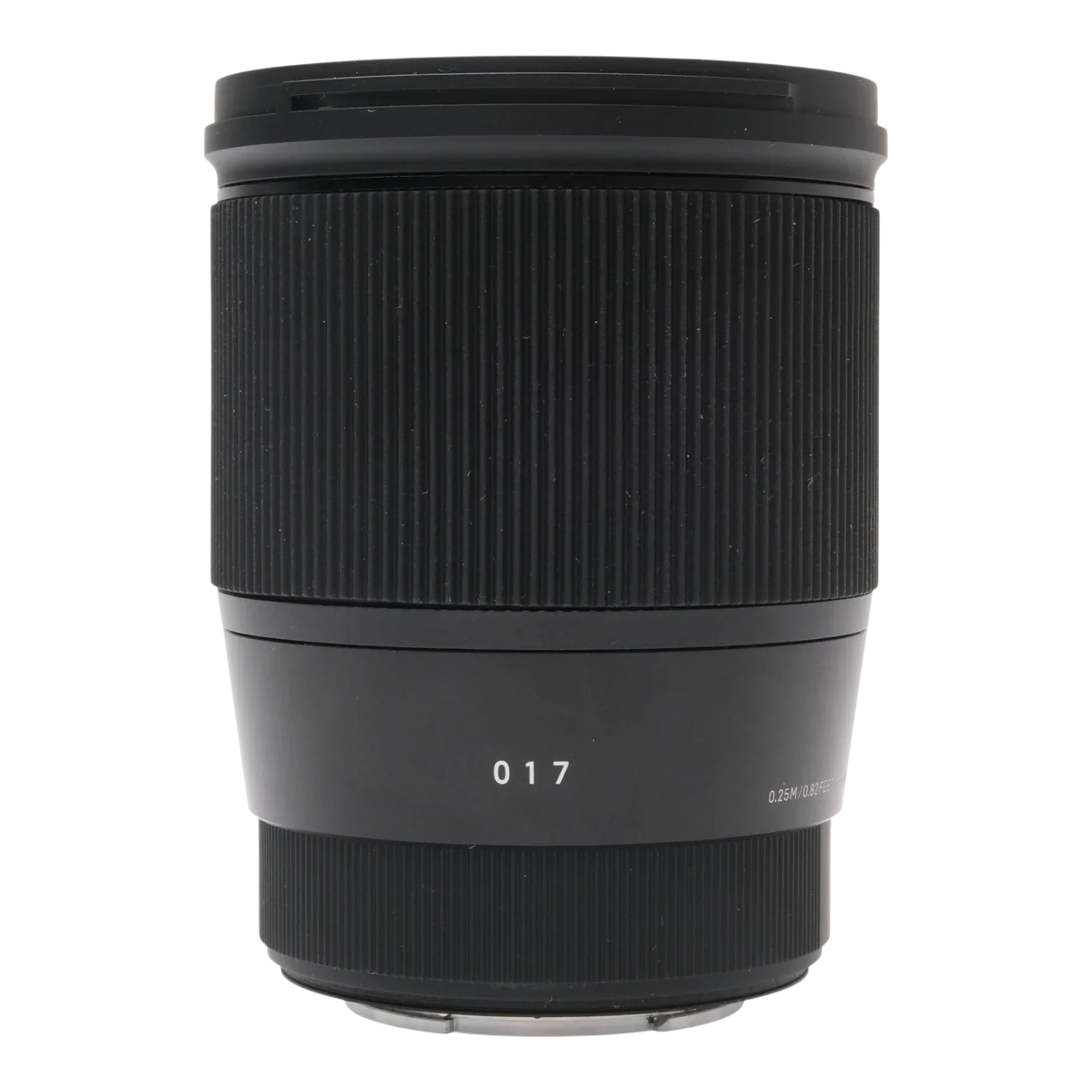 This Sigma 16mm f1.4 DC DN Contemporary Lens for Fuji XF, #56370494, is in great ocondition with minor handling wear. I rate it cosmetically a (9+). The focus ring is smooth, the autofocus and aperture function properly, and the glass is clean and clear with no haze, marks, or fungus. There are a few faint specks of dust inside, but they do not affect image quality. This lens includes a Sigma lens hood and front & rear caps. Please refer to the photos for details.