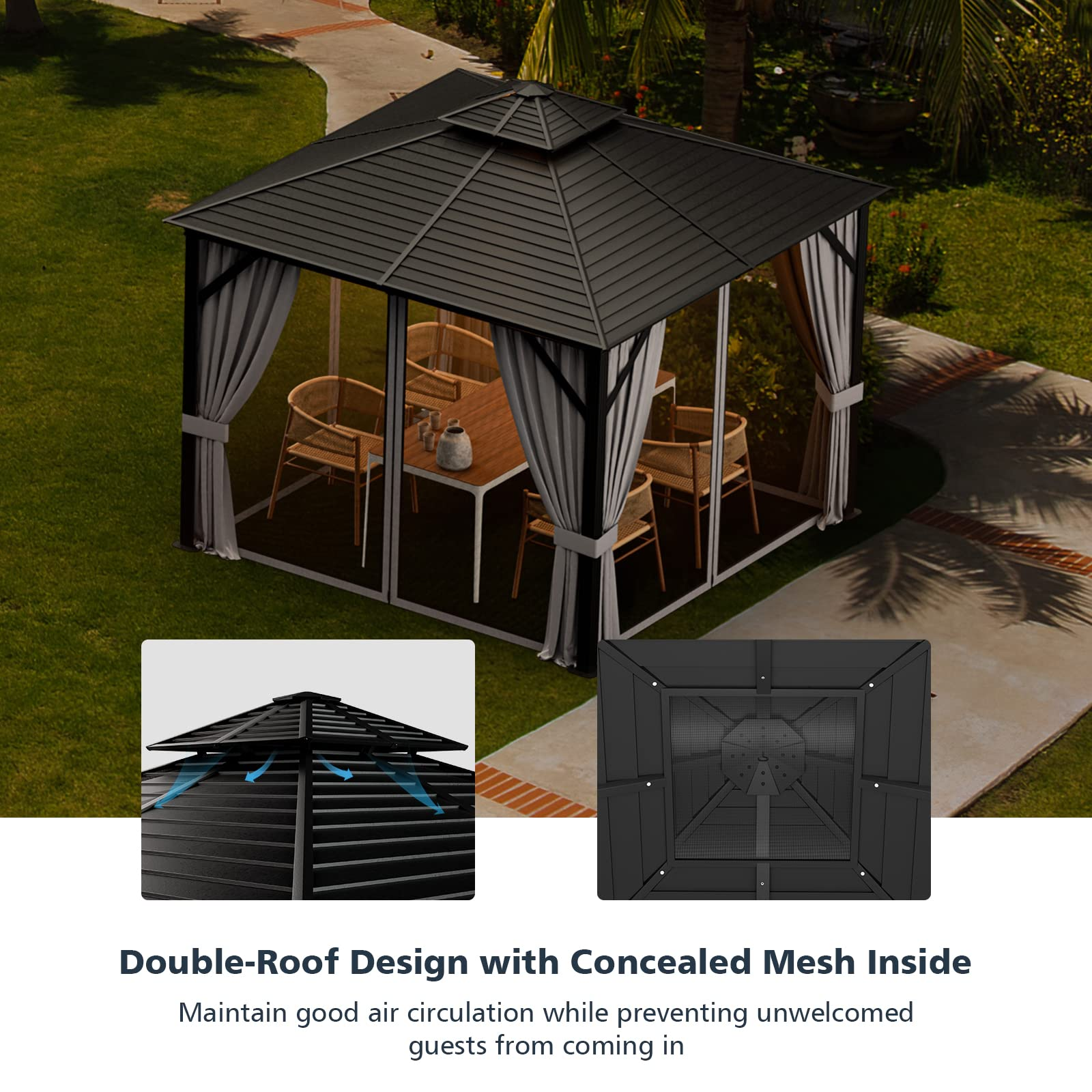 The 10x10 Ft hardtop gazebo provides enough room for your outdoor furniture, whether meeting friends, enjoying afternoon teas, enjoying meals, or having BBQ parties, it can be a perfect choice. The double-roof design ensures enough air circulation while improving stability in windy conditions. And there exists a ceiling hook bringing convenience for hanging lights. Besides, the permanent gazebo is designed with netting and curtains to protect you from any "unwanted visitors", rain, and ultraviolet while adding more privacy. More importantly, instead of using a fabric polycarbonate top, our patio gazebo adopts galvanized steel hardtop, which is not only fade-resistant and ultraviolet-resistant but also sturdy enough to withhold strong snow and wind. Also, the aluminum frame and 4 reinforced corners add more durability and safety.
