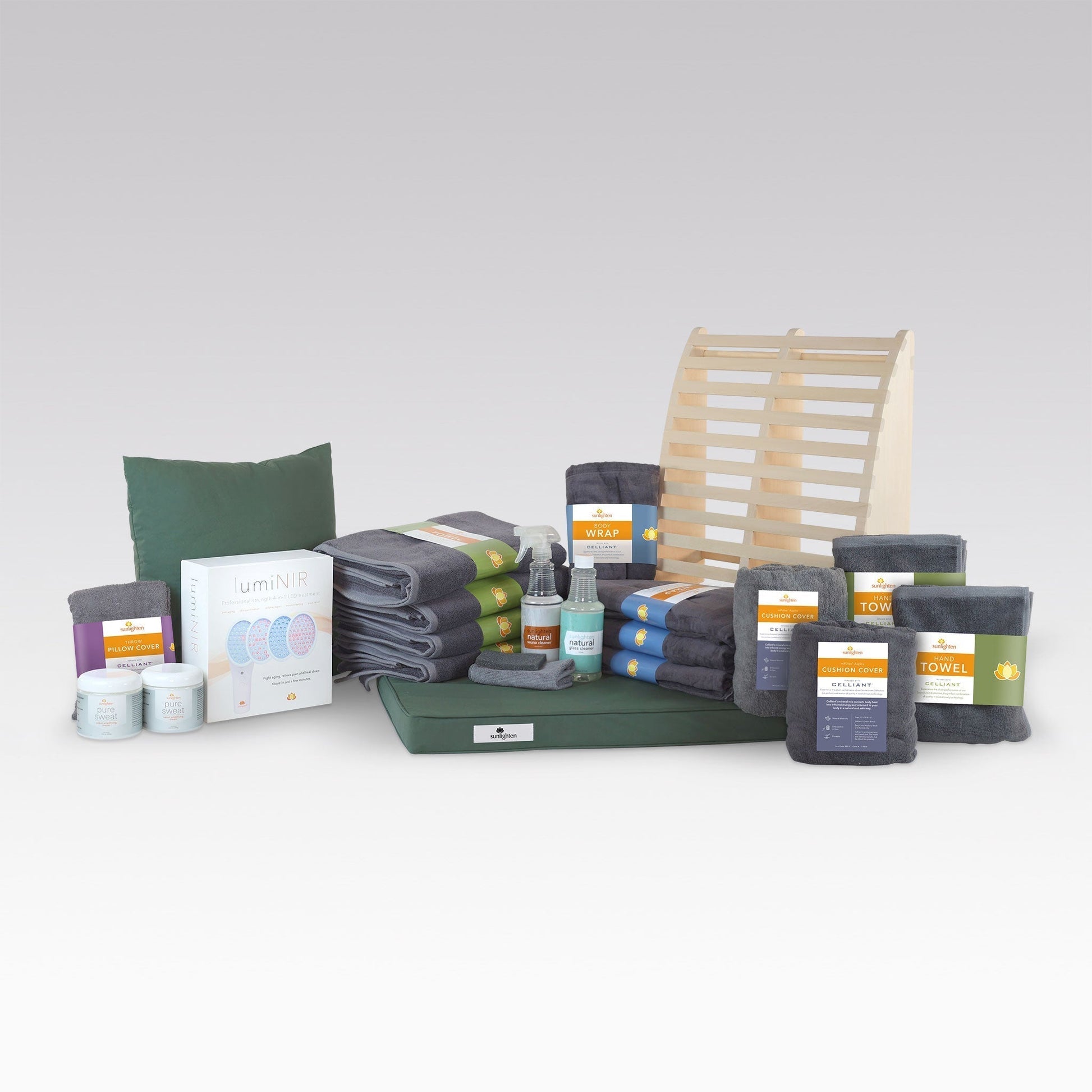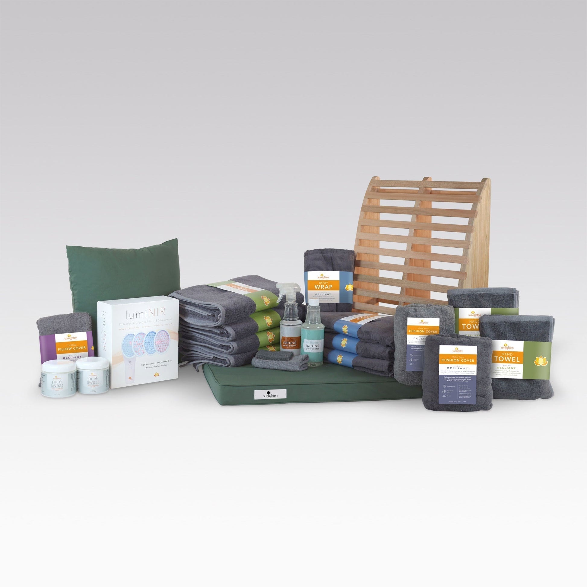 Everything you could possibly want to make your sauna the ultimate escape and wellness sanctuary. Includes an ample sauna linen supply, every available seated comfort option, sweat amplifying cream, and our handheld light therapy device with 4 different options for anti-aging, cell renewal, clear skin, muscle recovery, pain relief and wound healing. Enjoy a perfectly clean sauna every time with special cleaning supplies also included in the package. Create your own personal oasis with the Ultimate Rejuvenation Package - 1 & 2 Person Saunas!
