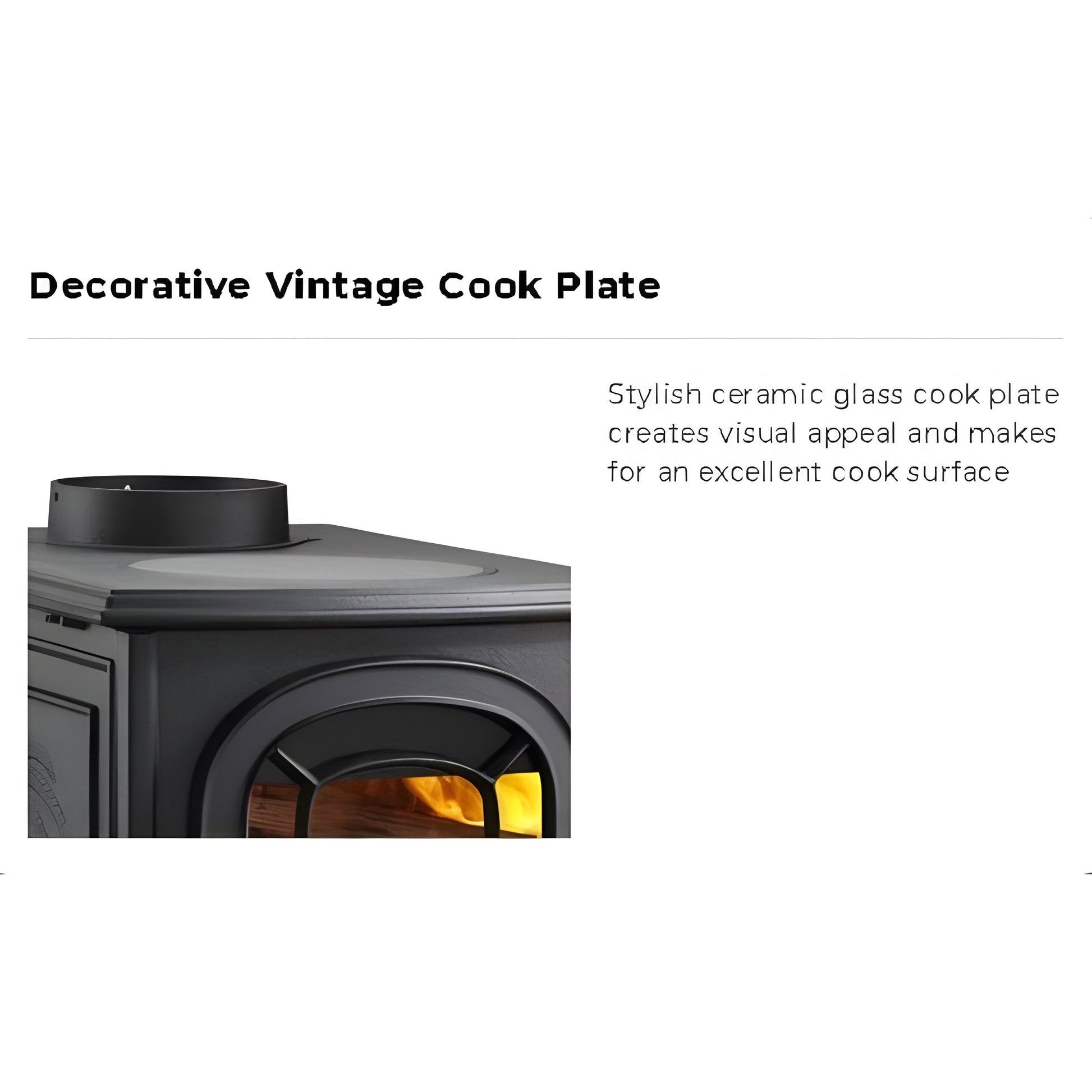 The north-south design and integrated ash pan allow you to load the logs and clean them with ease. With its top plate cooking surface and Classic Black color, the Aspen C3 stands head and shoulders above other small wood stoves.