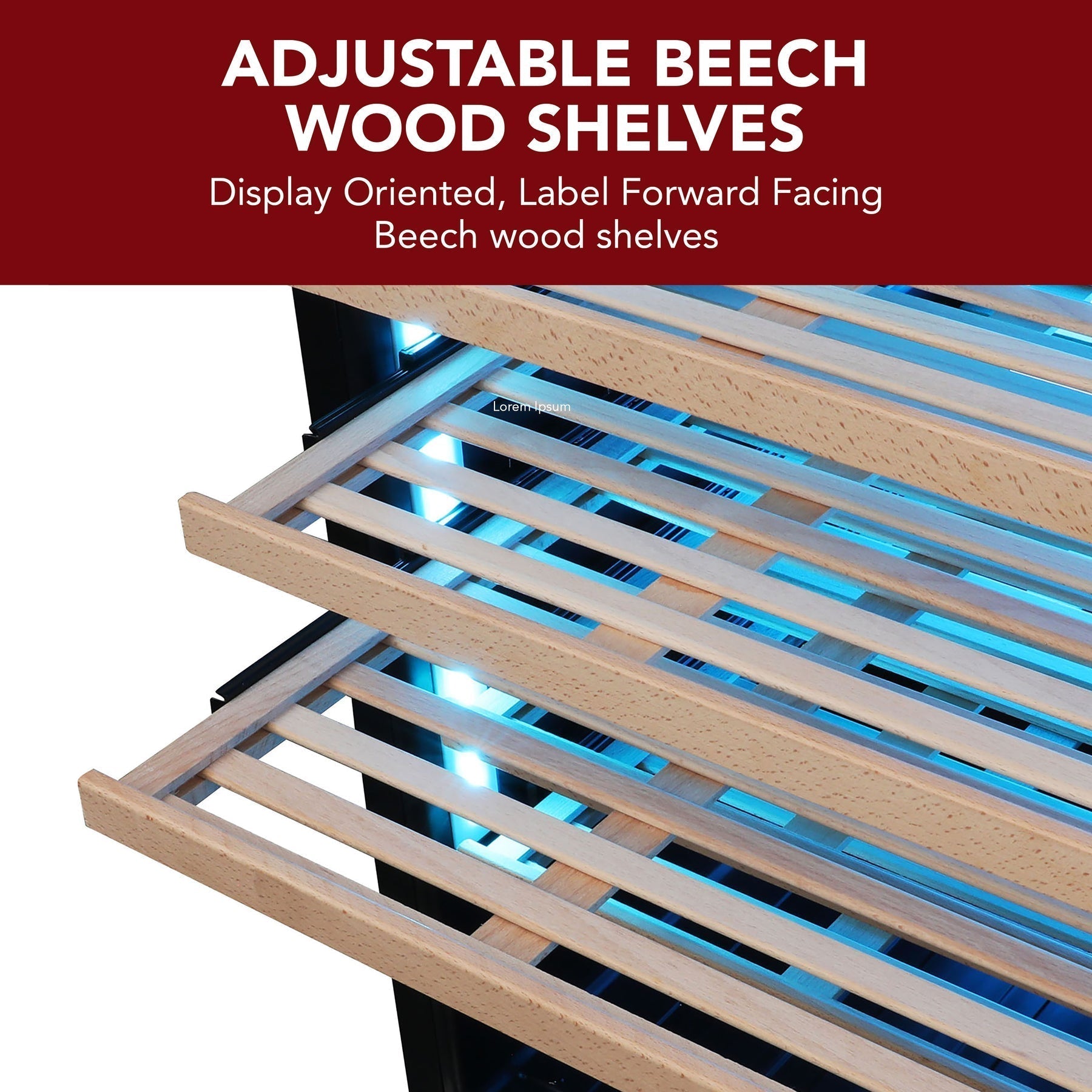 The Vinotemp Vinoglow 41-Bottle Single-Zone Wine Cooler is a masterful creation that combines cutting-edge technology with elegant design, offering wine enthusiasts a superior storage solution. With its patented rear panel, customizable color options, and UV-protected glass doors, this wine cooler ensures that your precious wine collection is stored in optimal conditions. The Vinoglow 41-Bottle Single-Zone Wine Cooler features a patented rear panel that allows you to customize the lighting to suit your preference. This unique feature not only adds a touch of elegance to your wine storage area but also provides functionality by allowing you to easily view and select your wines. Say goodbye to rummaging through your wine bottles to find the one you're looking for. The Vinoglow wine cooler comes with label forward facing racks that allow you to organize your bottles efficiently. This display-oriented design not only enhances the visual appeal of your wine collection but also makes it convenient to access and select your wines. Experience convenience at your fingertips with the Vinotemp Vinoglow wine cooler's touch control panel. The TFT LCD display provides a clear and user-friendly interface, while the integrated RGB color wheel allows you to customize the lighting to create the ambiance you desire. Adjusting the settings of your wine cooler has never been easier. Protect the quality and taste of your wines with the UV-resistant glass doors. UV rays can degrade the flavor and aroma of wines over time, but with this feature, you can be rest assured that your wines are shielded from harmful light exposure. Ensure the optimal storage conditions for your wines with the temperature and door alarm features. You will be alerted if there are any fluctuations in temperature or if the door is left ajar, allowing you to take immediate action to preserve the quality of your wines. The Vinotemp Vinoglow wine cooler offers a temperature range of 39°-68°F, ideal for storing both red and white wines at their recommended serving temperatures. This precise temperature control ensures that your wines age gracefully and are ready to be enjoyed at their best. For those observant of the Sabbath, it features a Sabbath mode, allowing you to disable certain electrical features for religious observance while still maintaining the desired temperature for your wines. The adjustable beech wood shelves of the wine cooler can extend up to 90%, providing flexibility to accommodate various bottle sizes and shapes. The natural beauty of the beech wood complements the aesthetics of your wine collection while ensuring secure and stable storage. With the reversible door feature of the Vinoglow wine cooler, you can customize the door swing direction to suit the layout of your space. This flexibility allows for seamless integration of the wine cooler into your environment, enhancing both functionality and aesthetics. Rest easy knowing that your wine collection is protected with the security lock feature of the Vinotemp Vinoglow wine cooler. The lock provides an added layer of security, ensuring that only authorized individuals have access to your prized wines. Invest in the Vinotemp Vinoglow wine cooler and enhance the preservation and presentation of your prized wine collection.
